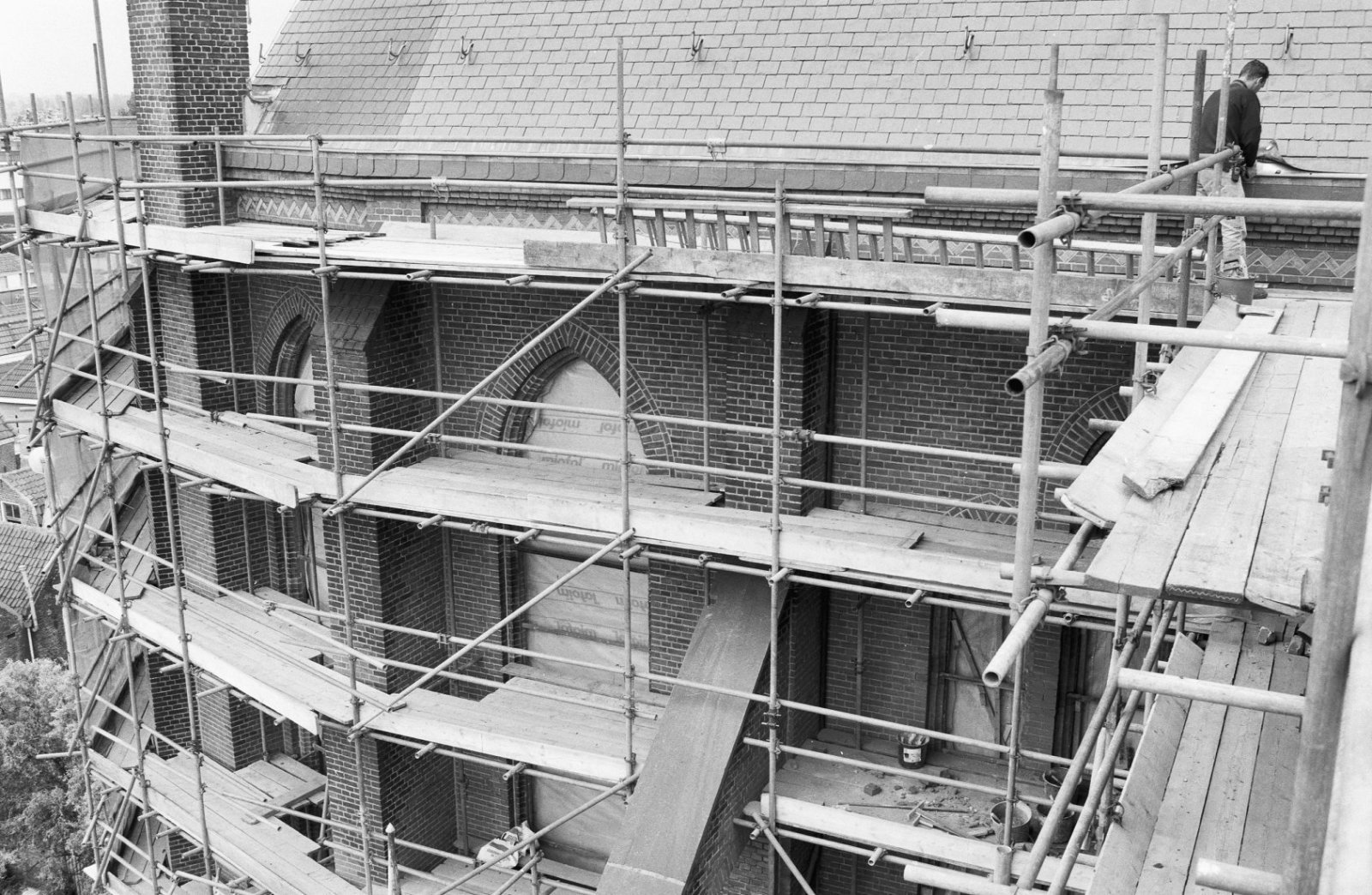 Zijgevel in de steigers tijdens restauratie