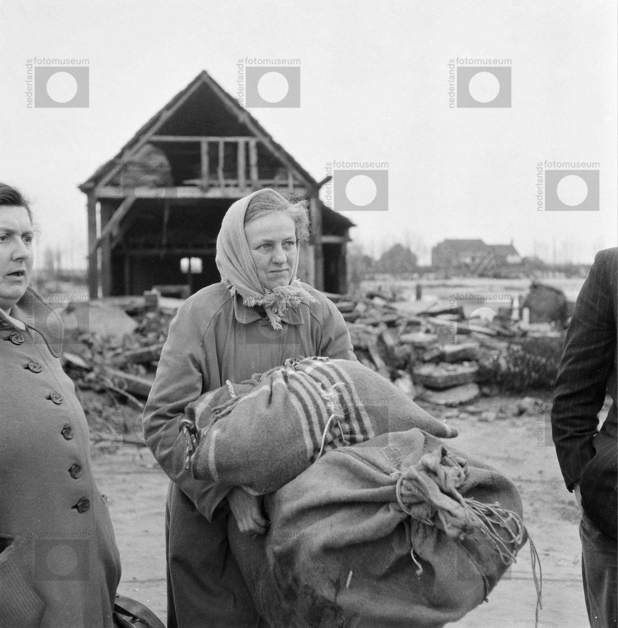 Mevr. Brekelmans bij restanten van haar woning, Nieu...