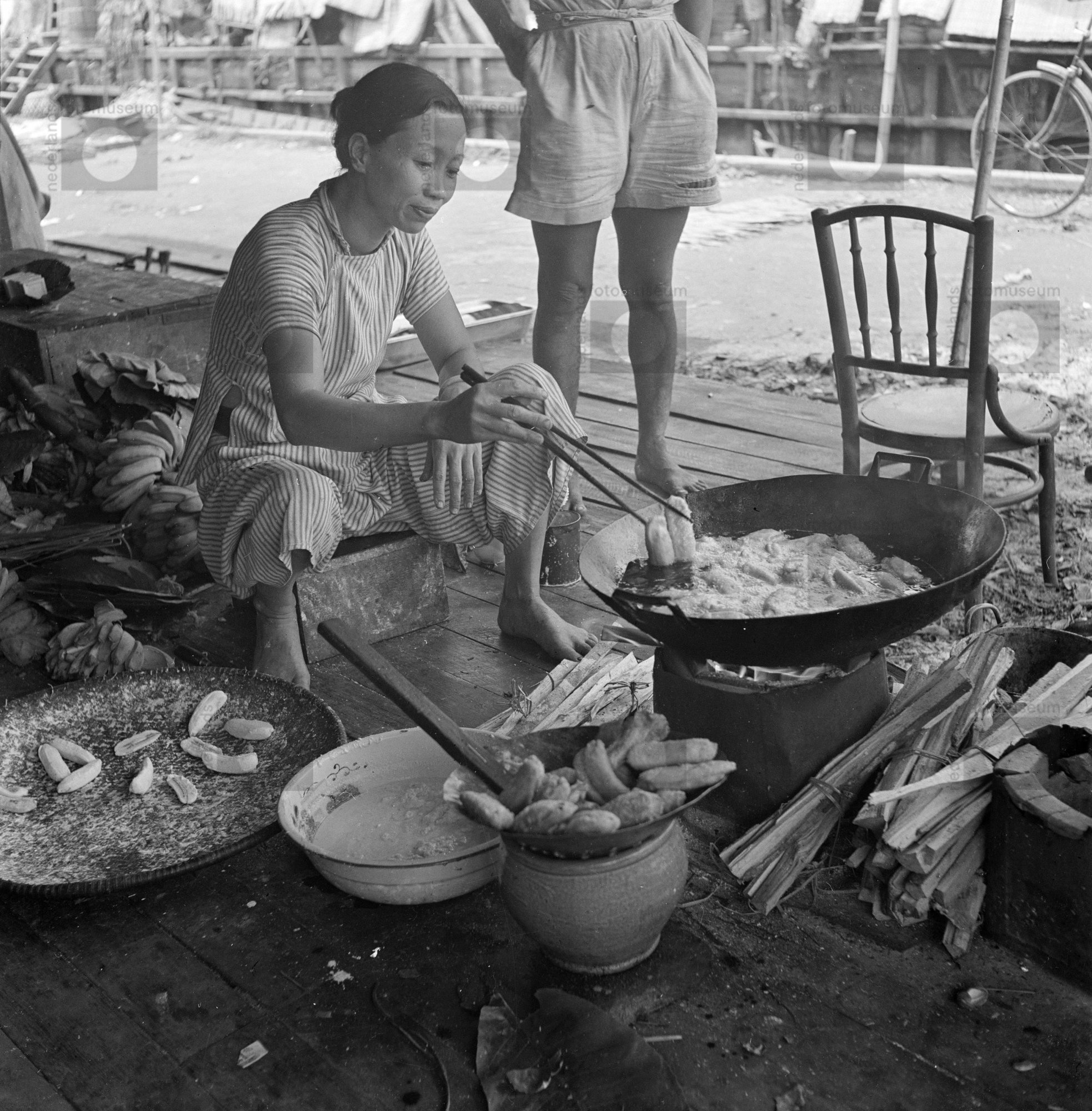 Een vrouw zit voedsel in een grote wok te bereiden, ...