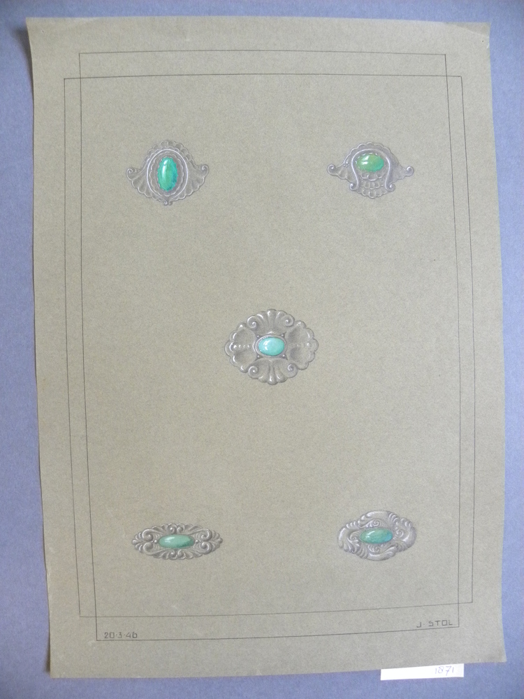 Tekeningen op bruin papier voorstellende ontwerpen d...