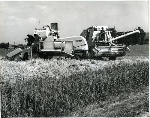 Foto in zwart-wit van twee maaidorsers door J.D. de ...