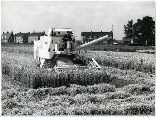 Foto in zwart-wit van een Clayson maaidorsers op een...