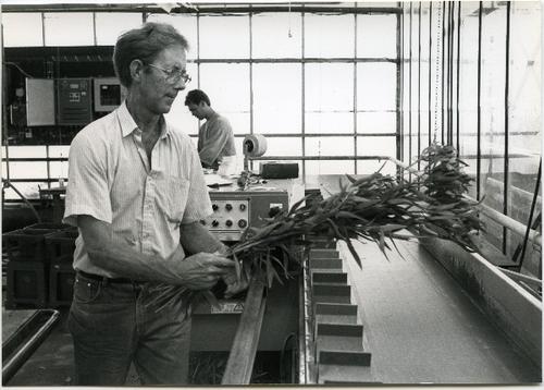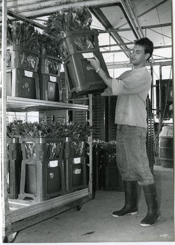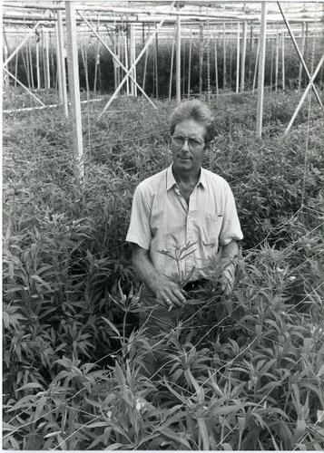 Foto in zwart-wit van kassen met alstroemeria's door...