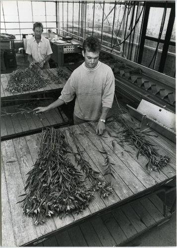 Foto in zwart-wit van het inpakken van alstroemeria'...