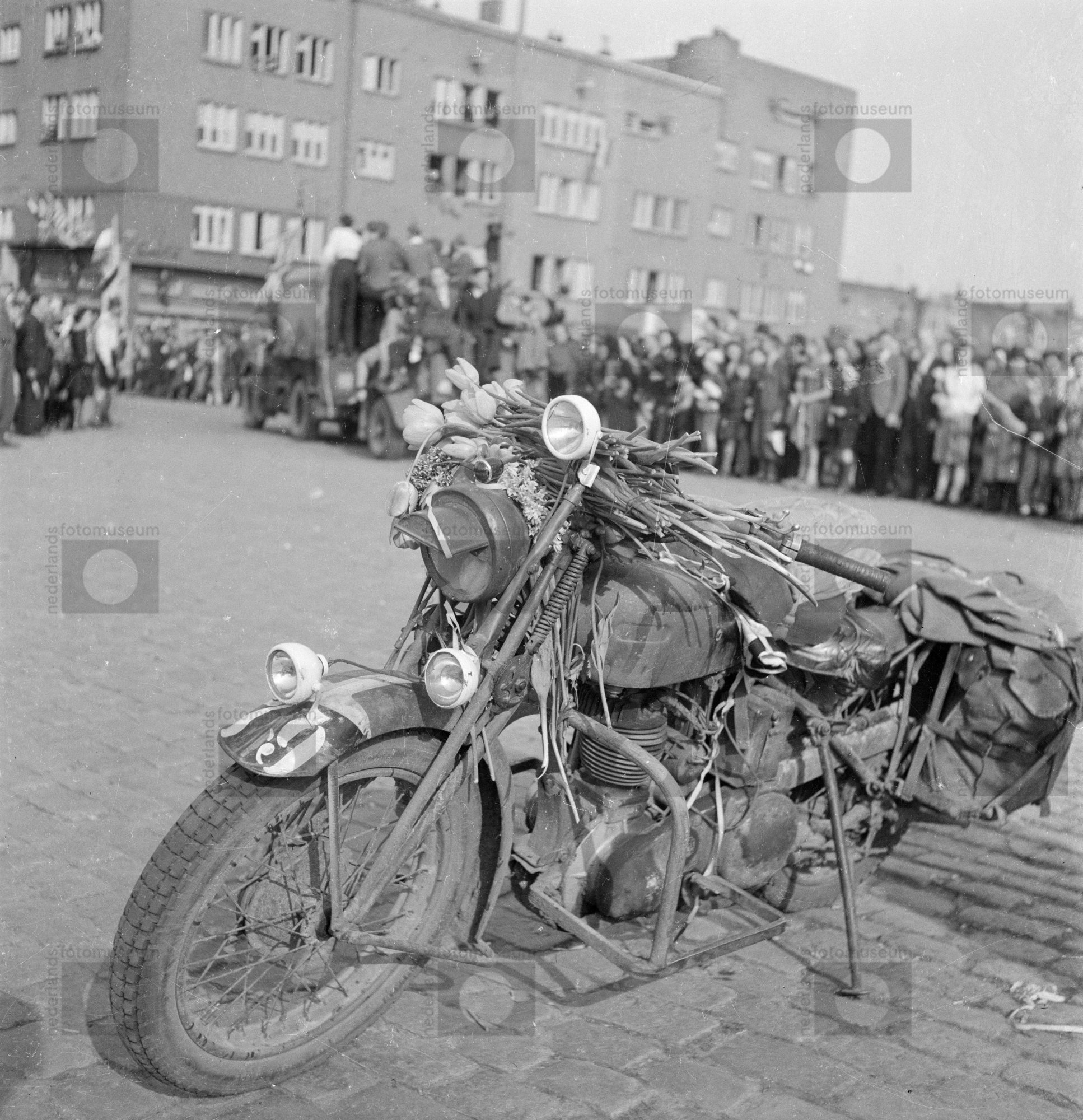 Bloemen op motorfiets, intocht Canadese militairen t...