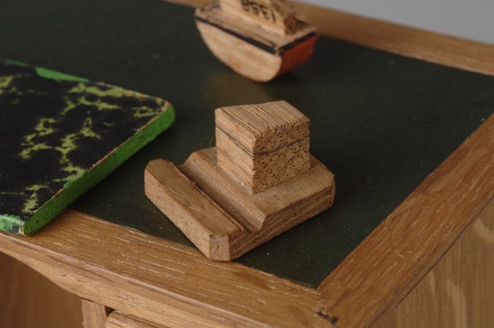 Houten miniatuur pennebakje en inktpot