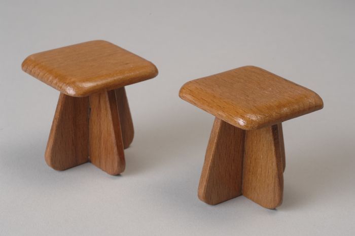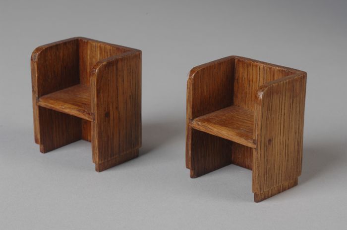 Twee eikenhouten miniatuur stoeltjes, dichte rug- en...
