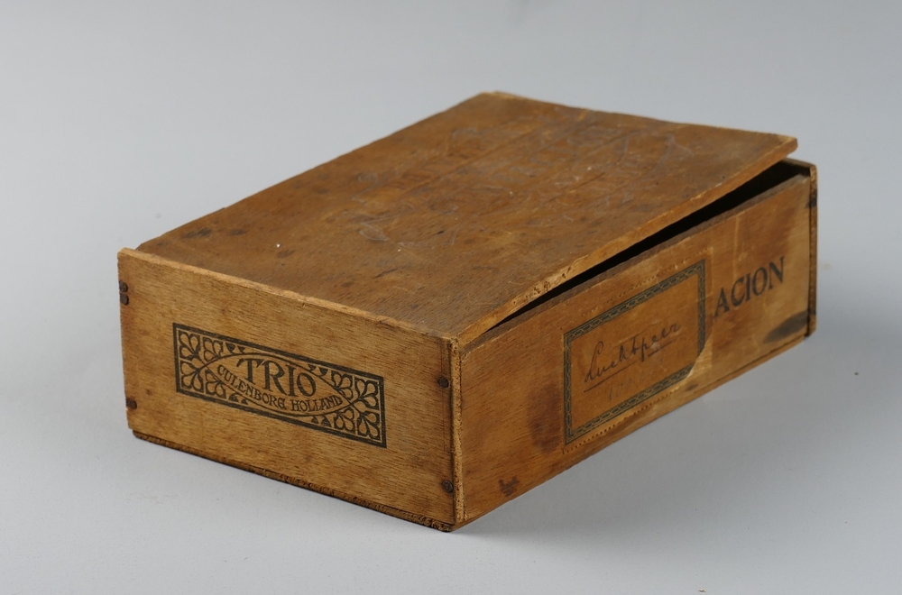 Sigarenkistje van hout met opdruk in zwart en gepers...