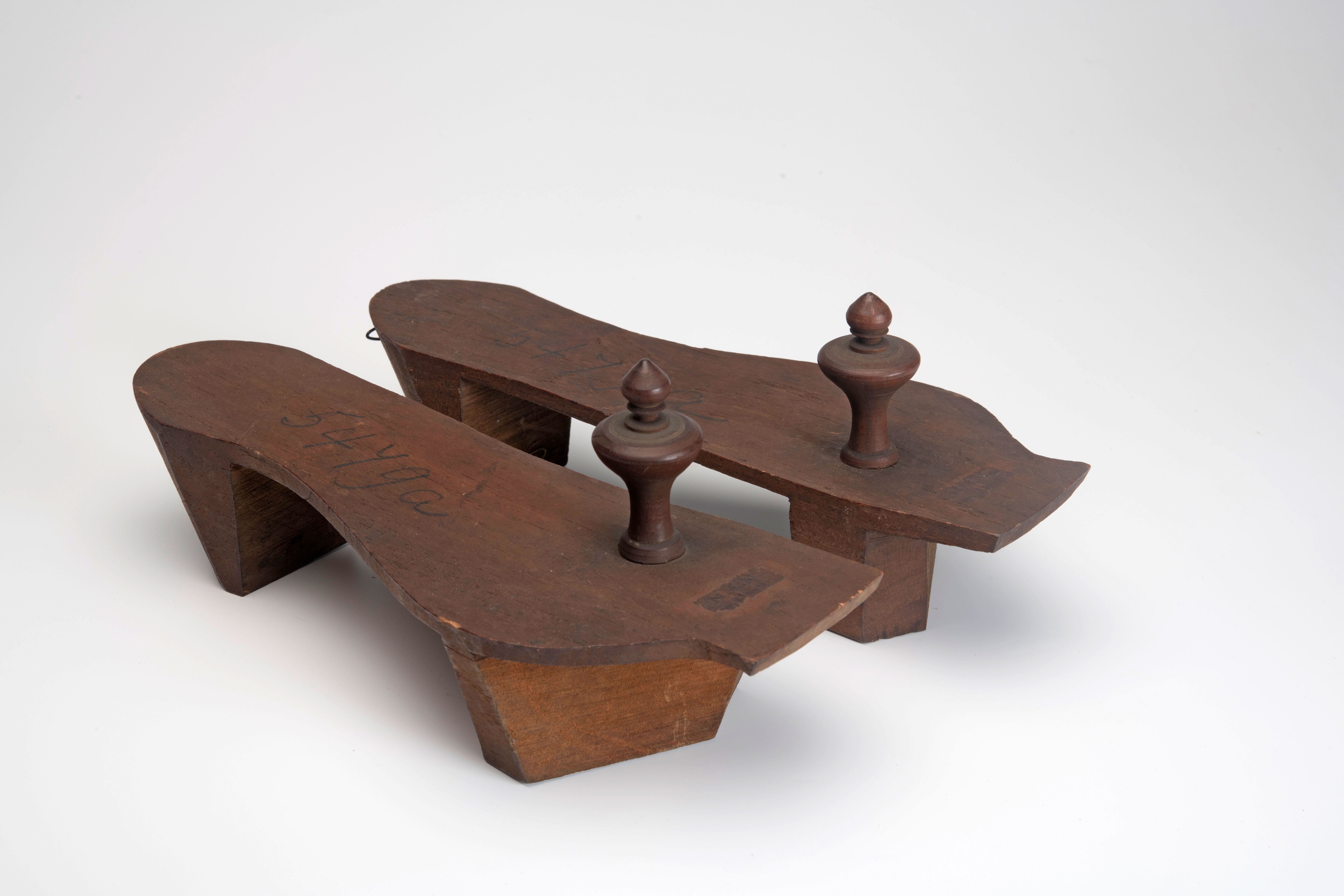 Een paar houten slippers met houten knoppen
