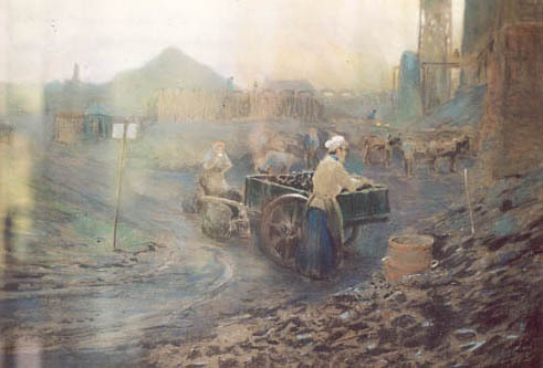 Mijnlandschap in Limburg met brikettenverkoopster