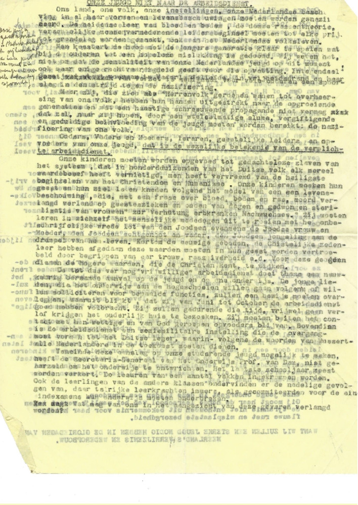 Pamflet Onze Jeugd niet naar de Arbeidsdienst, 1943
