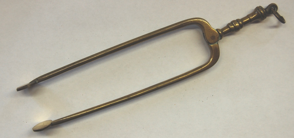 tang voor vuurstoof met twee lange geelkoperen benen...