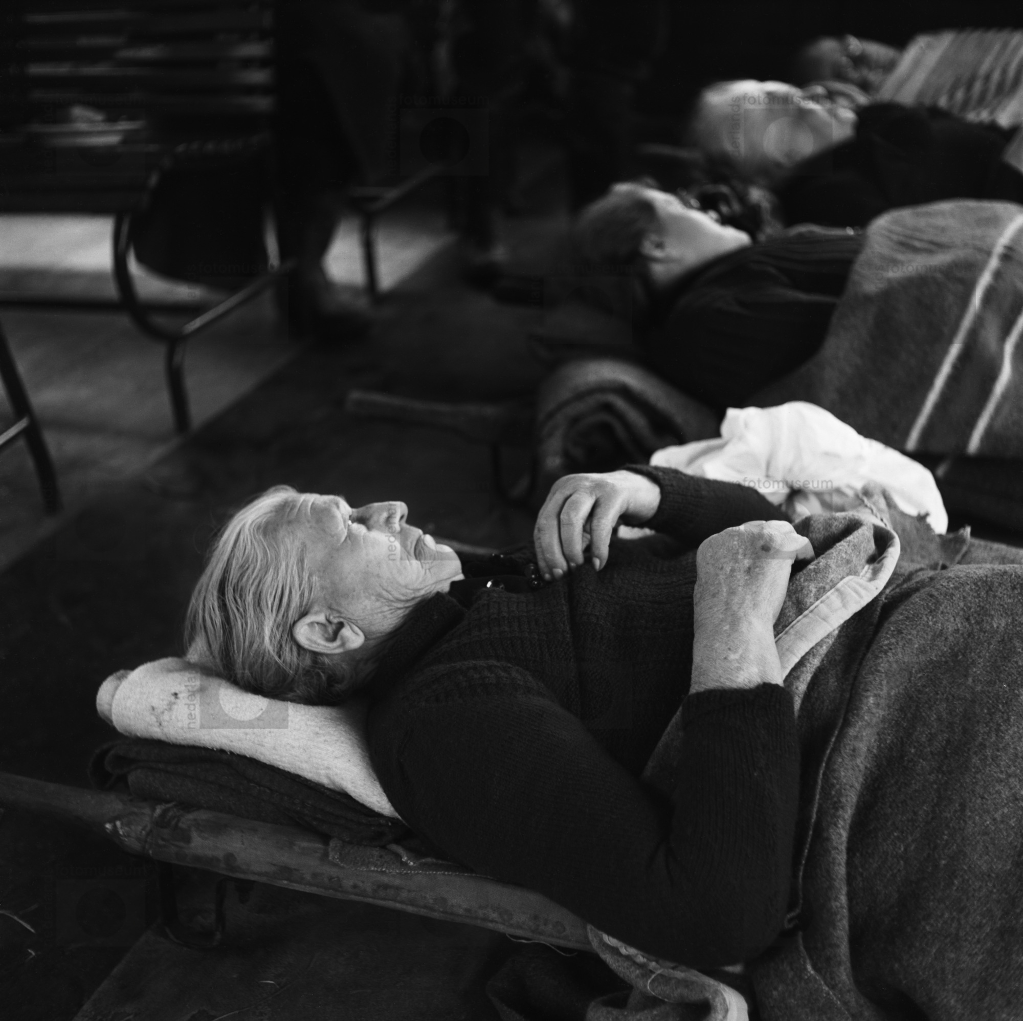 Oude vrouw rustend op veldbed na de Watersnoodramp, ...