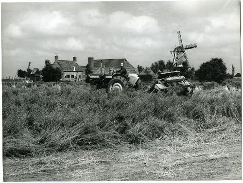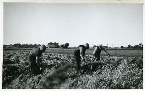 Foto in zwart-wit van het trekken van vlas door J.D....