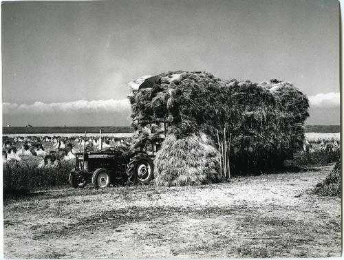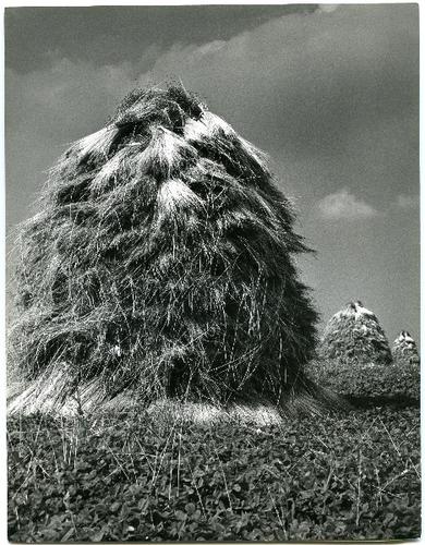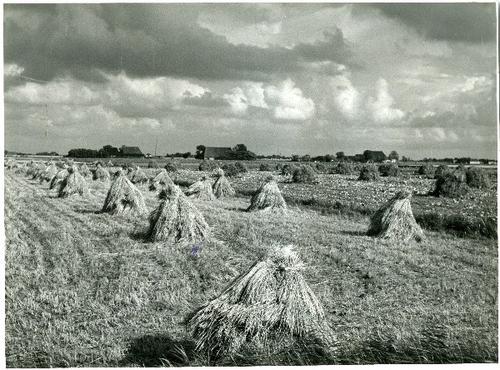 Foto in zwart-wit van schoven graan op hokken door J...