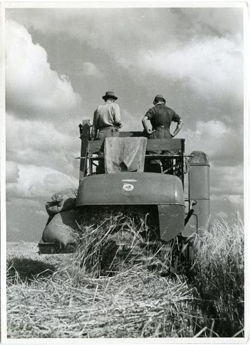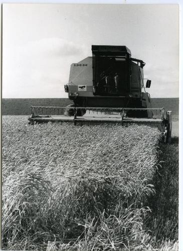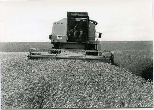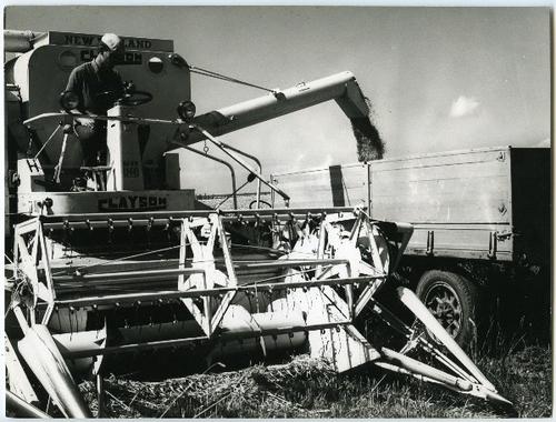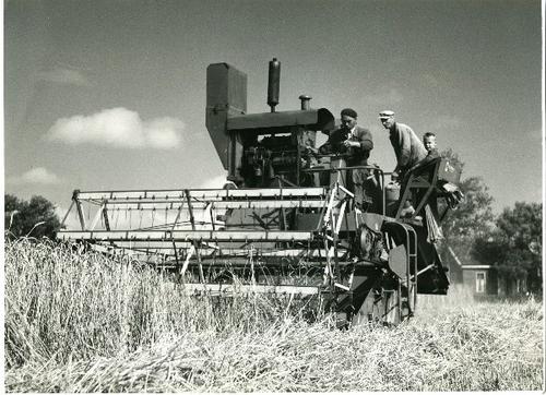 Foto in zwart-wit van een maaidorser, merk New Holla...