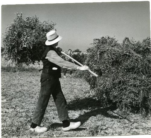 Foto in zwart-wit van het handmatig trekken van vlas...