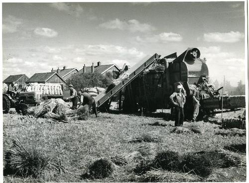 Foto in zwart-wit van het machinaal trekken van vlas...