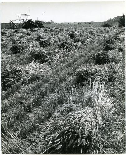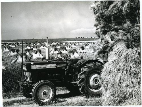 Foto in zwart-wit van vlas op schoven door J.D. de J...
