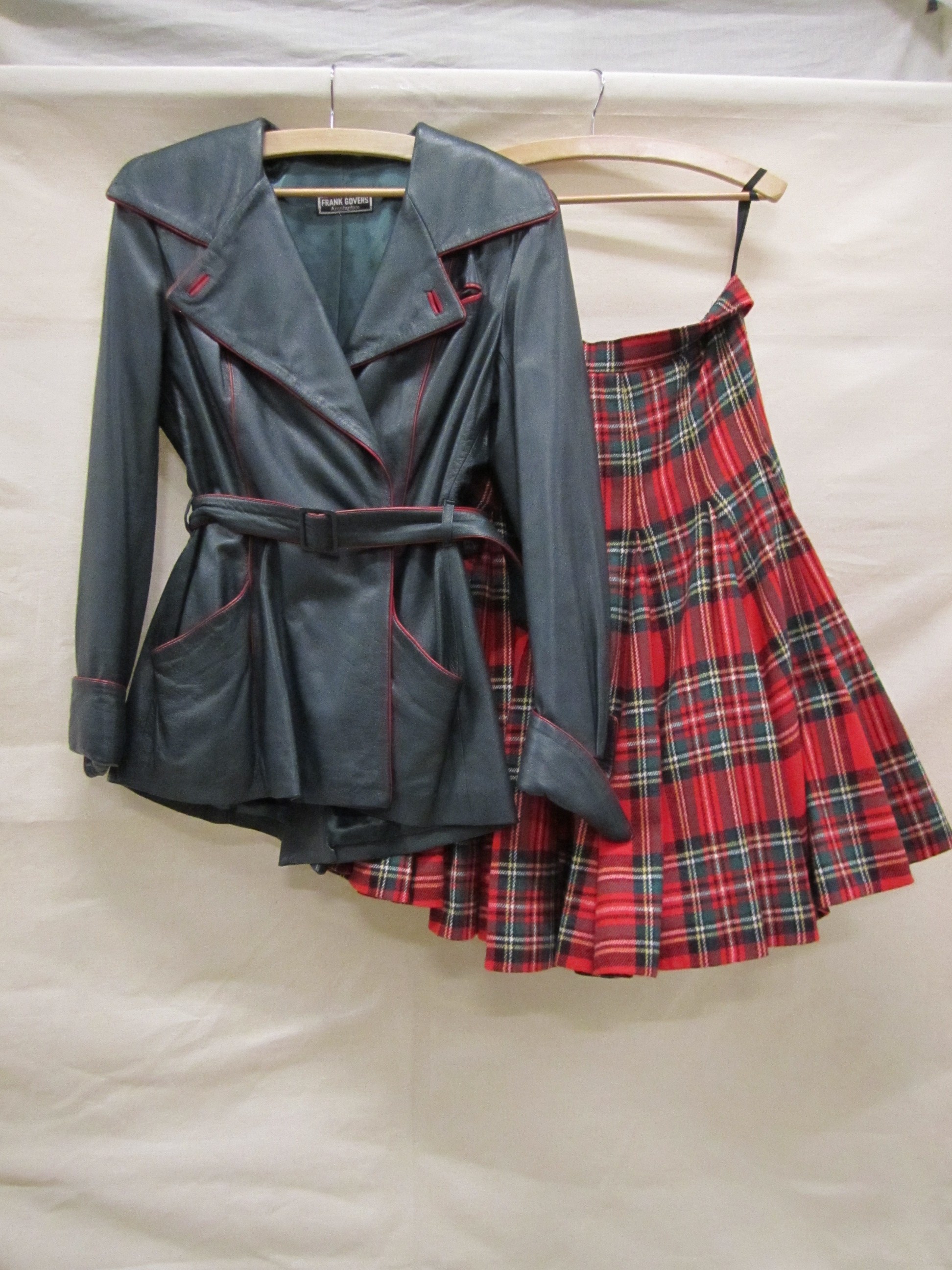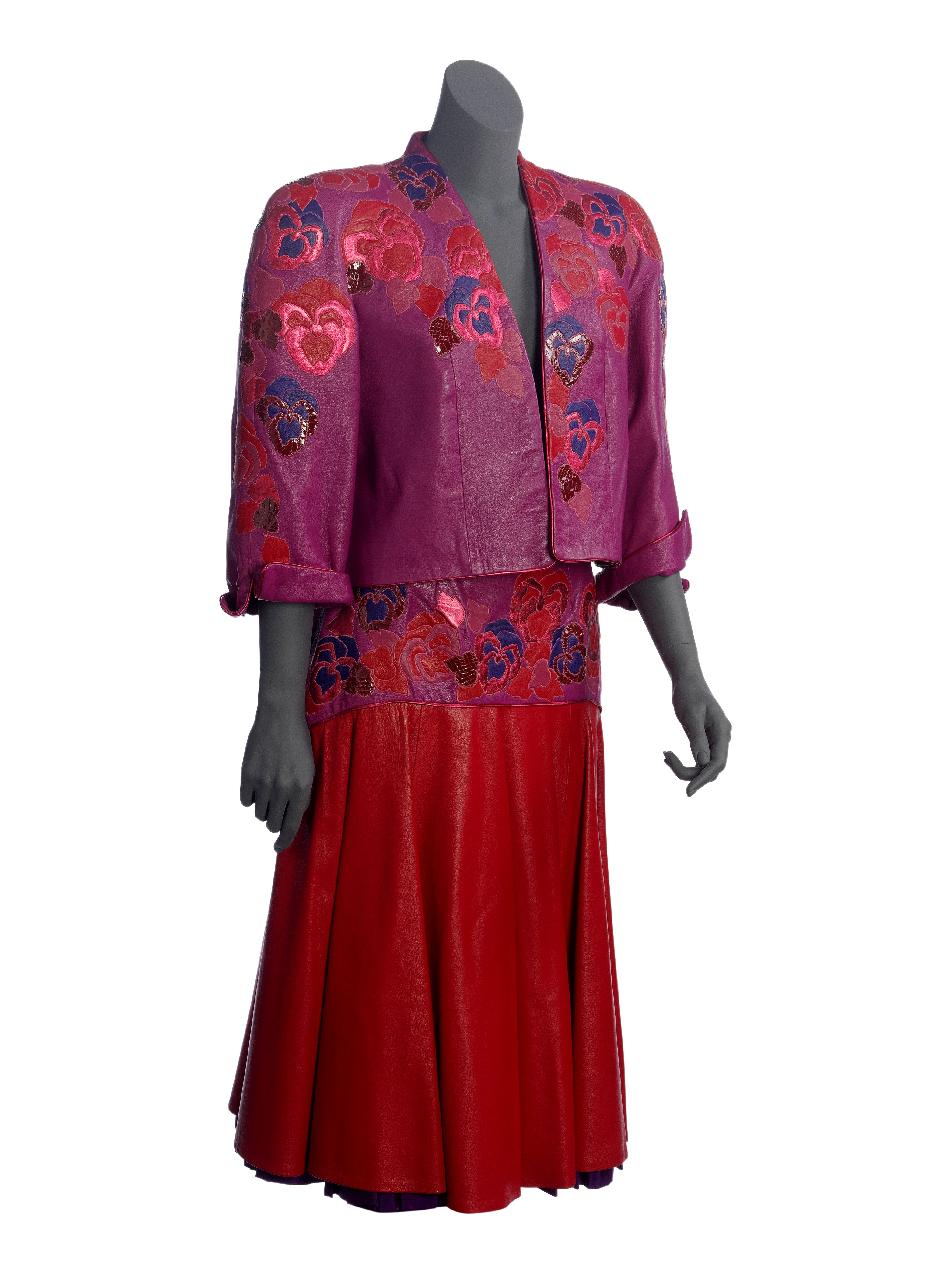 Mantelpak van leer in de kleuren rood en paars, met ...