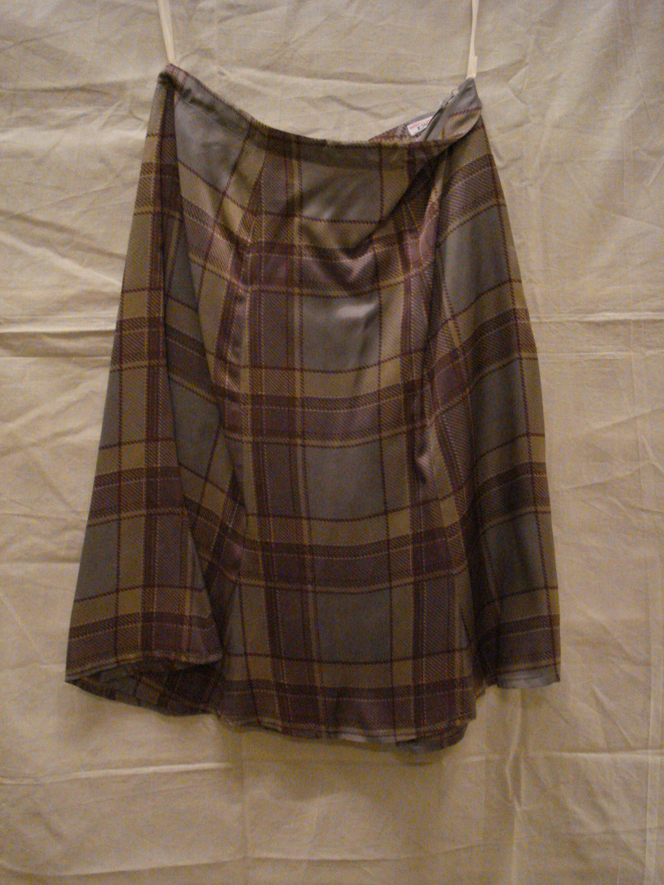 Rok van rayon, bedrukt met lichtbeige en paarse ruit...