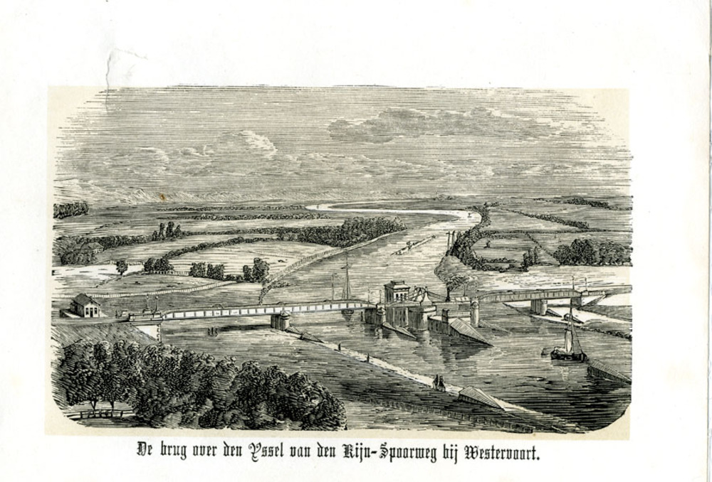 Ets op papier voorstellende de spoorbrug over de IJs...