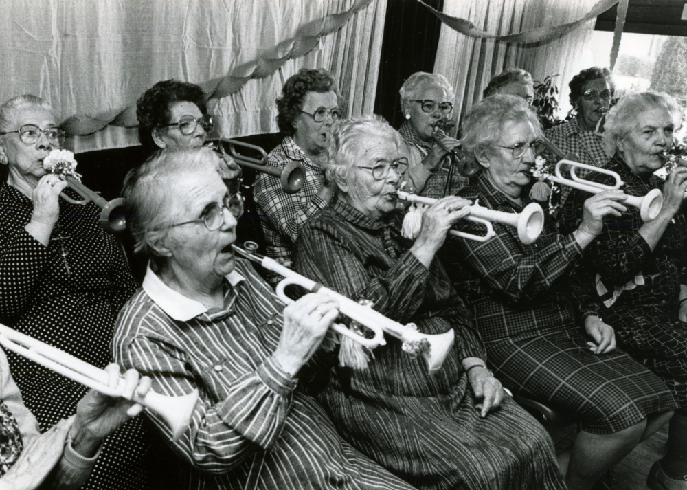 Zwart-wit foto van het huisorkest van het verzorging...