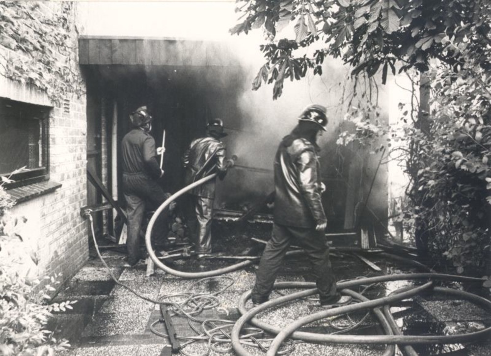 Zwart-wit foto van de brandweer bij een brand in Ang...
