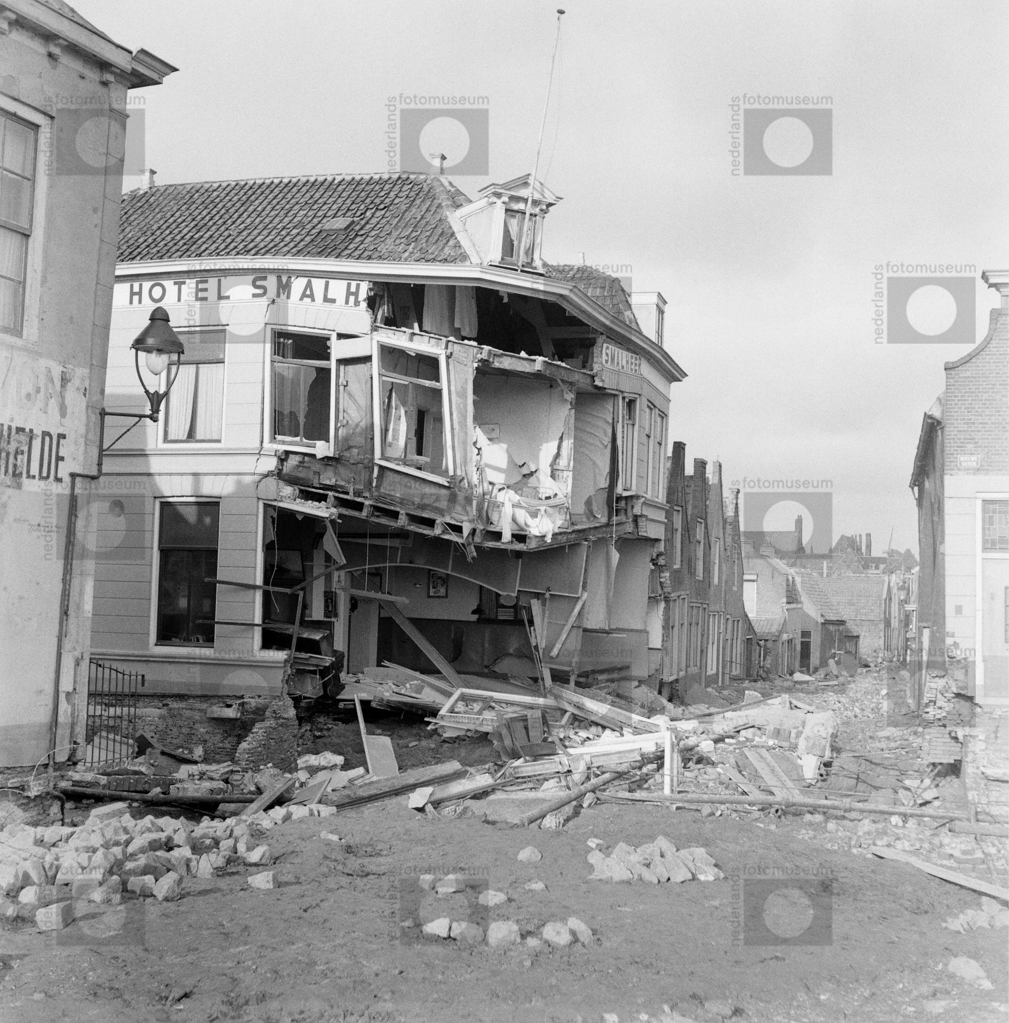 Beschadigde gevel van hotel 'Smalheer', Wate...