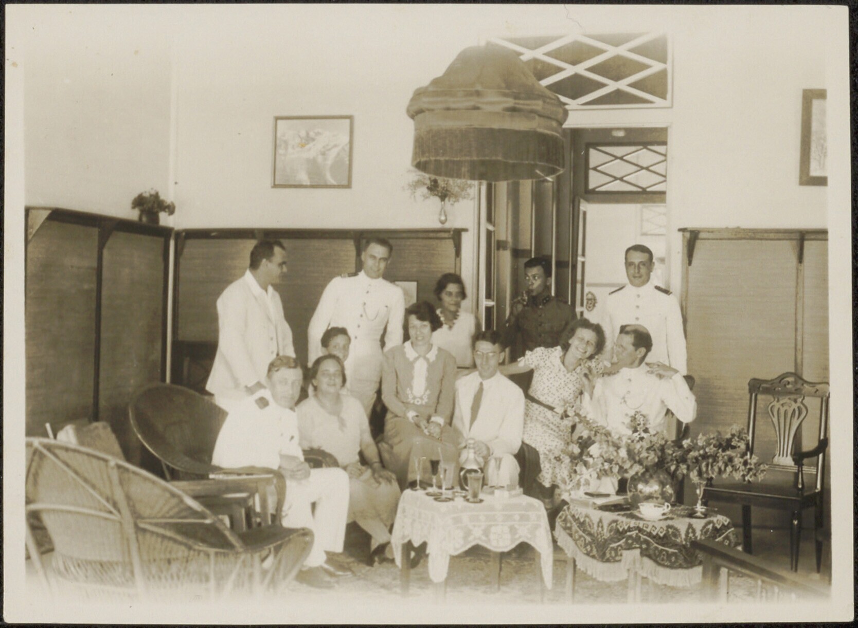 Groepsportret met enkele heren in uniform in de salon