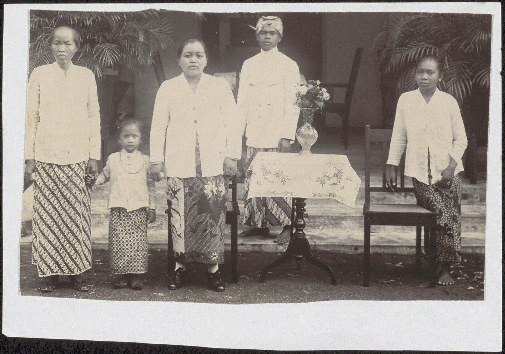 Groepsportret bij een tafel met een vaas bloemen