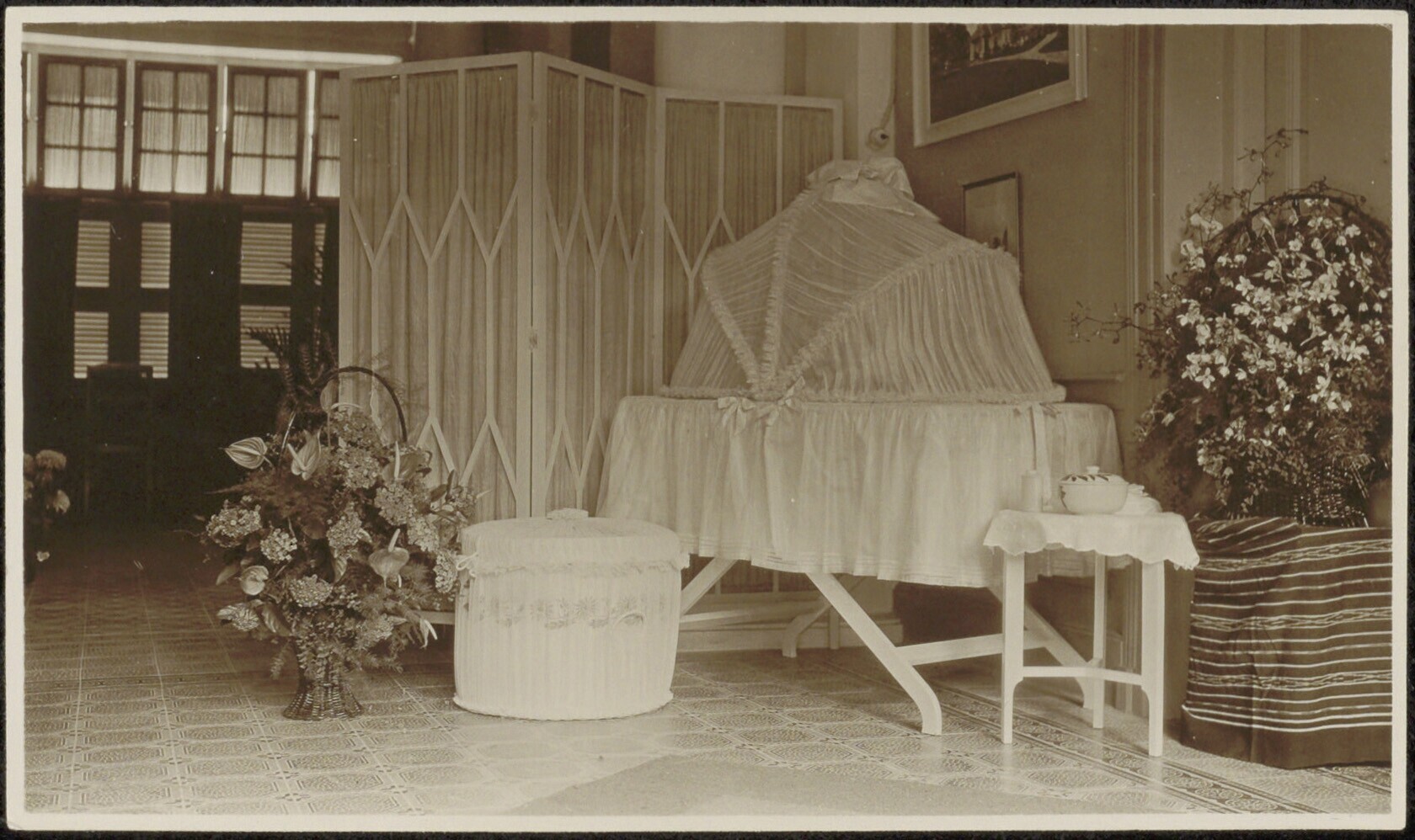 Wieg met klamboe, mand en bloemstukken voor een kame...