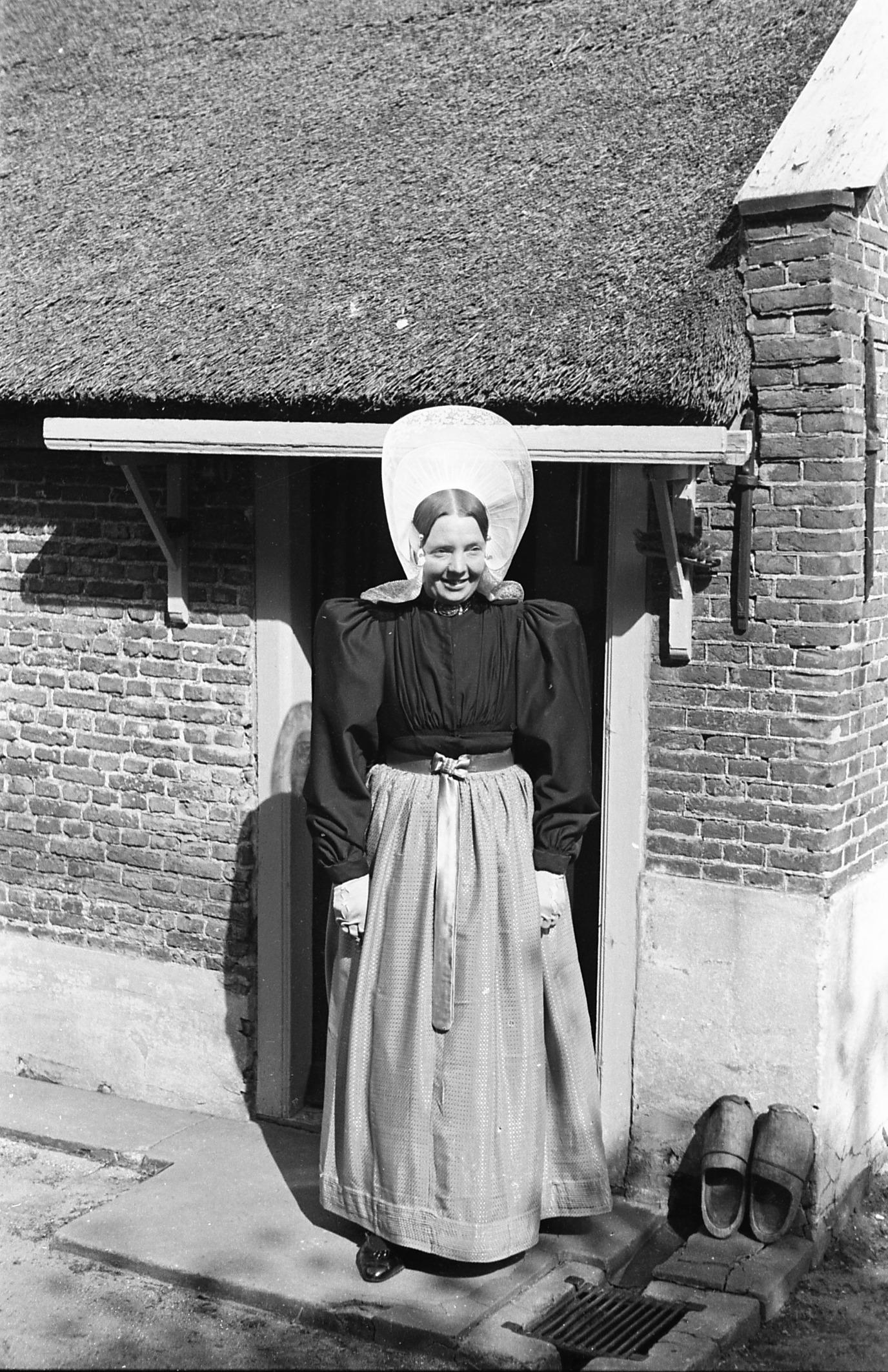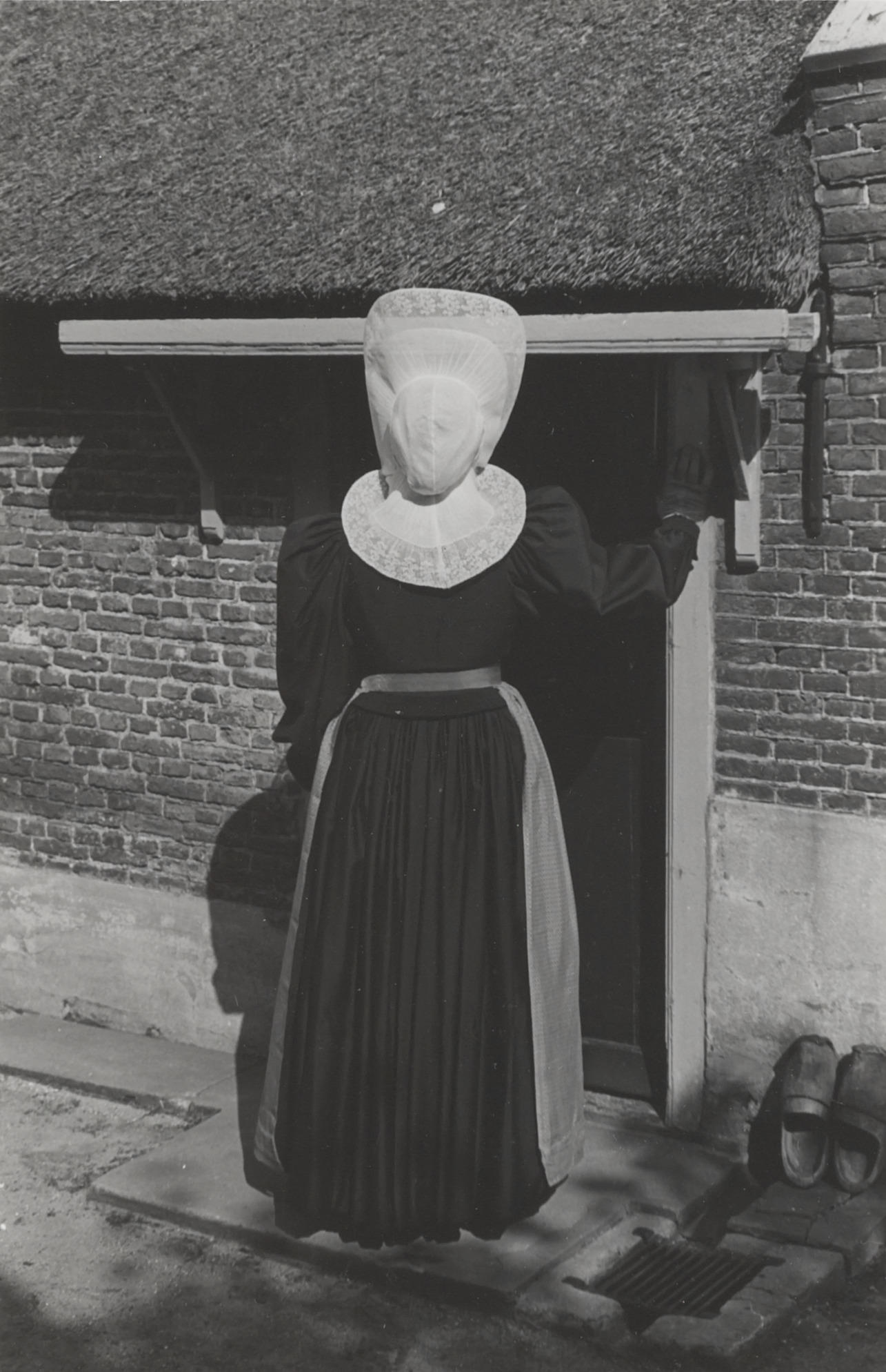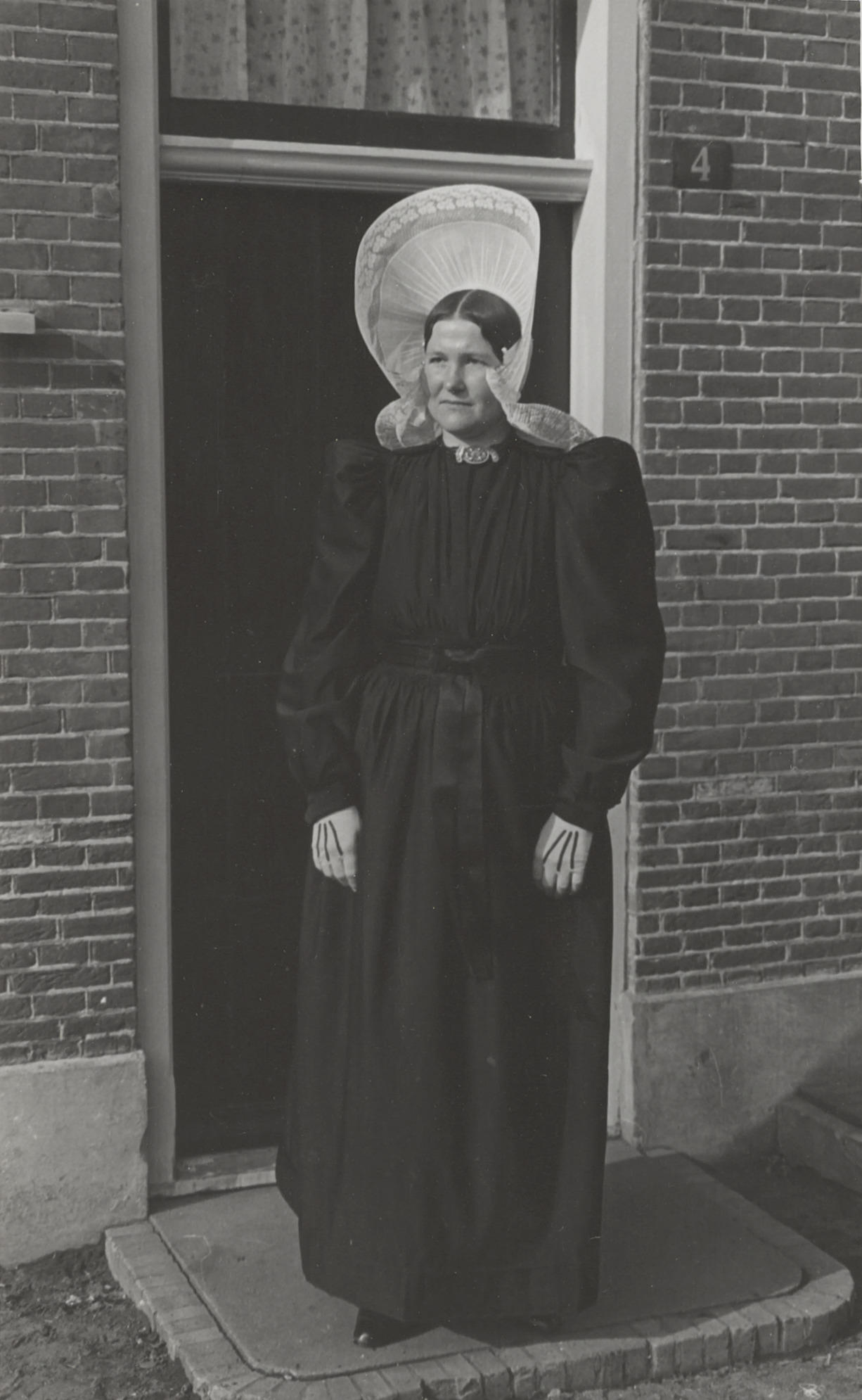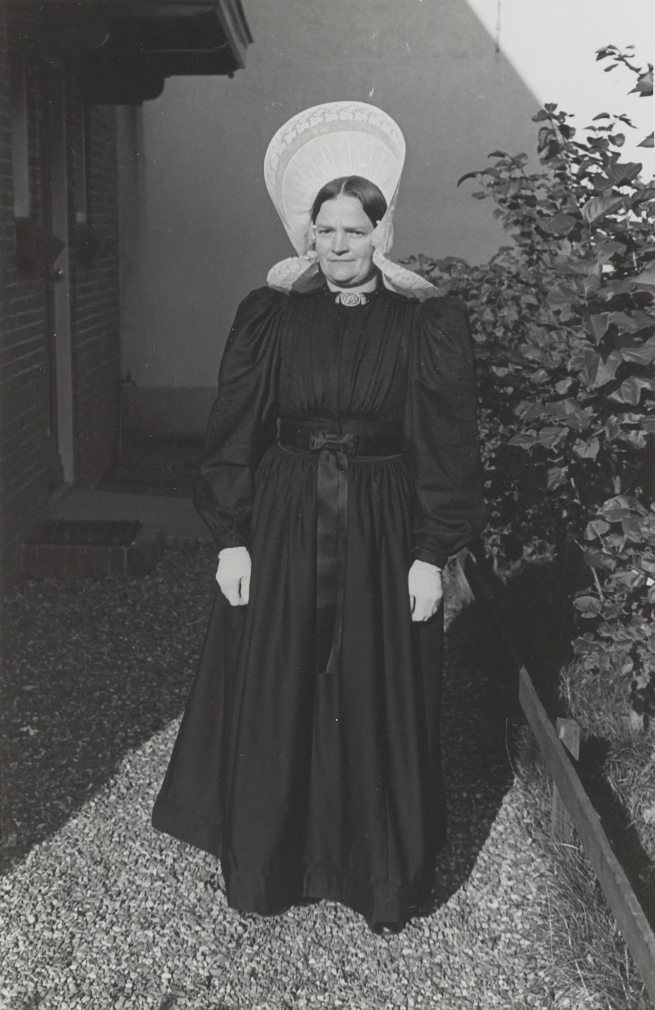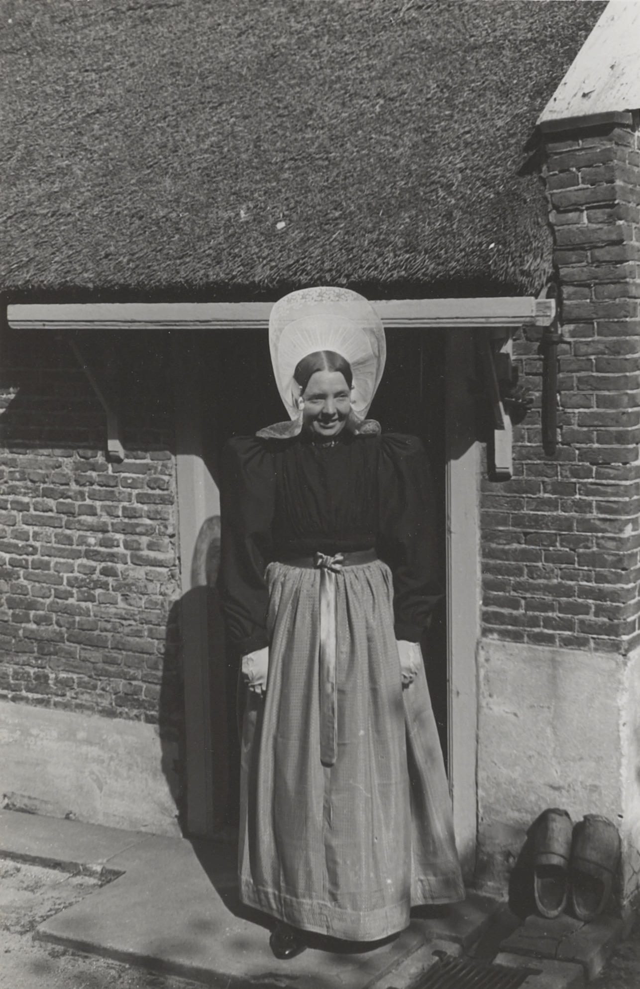 Vrouw in streekdracht, Huizen, 1945 (zwart-wit foto)