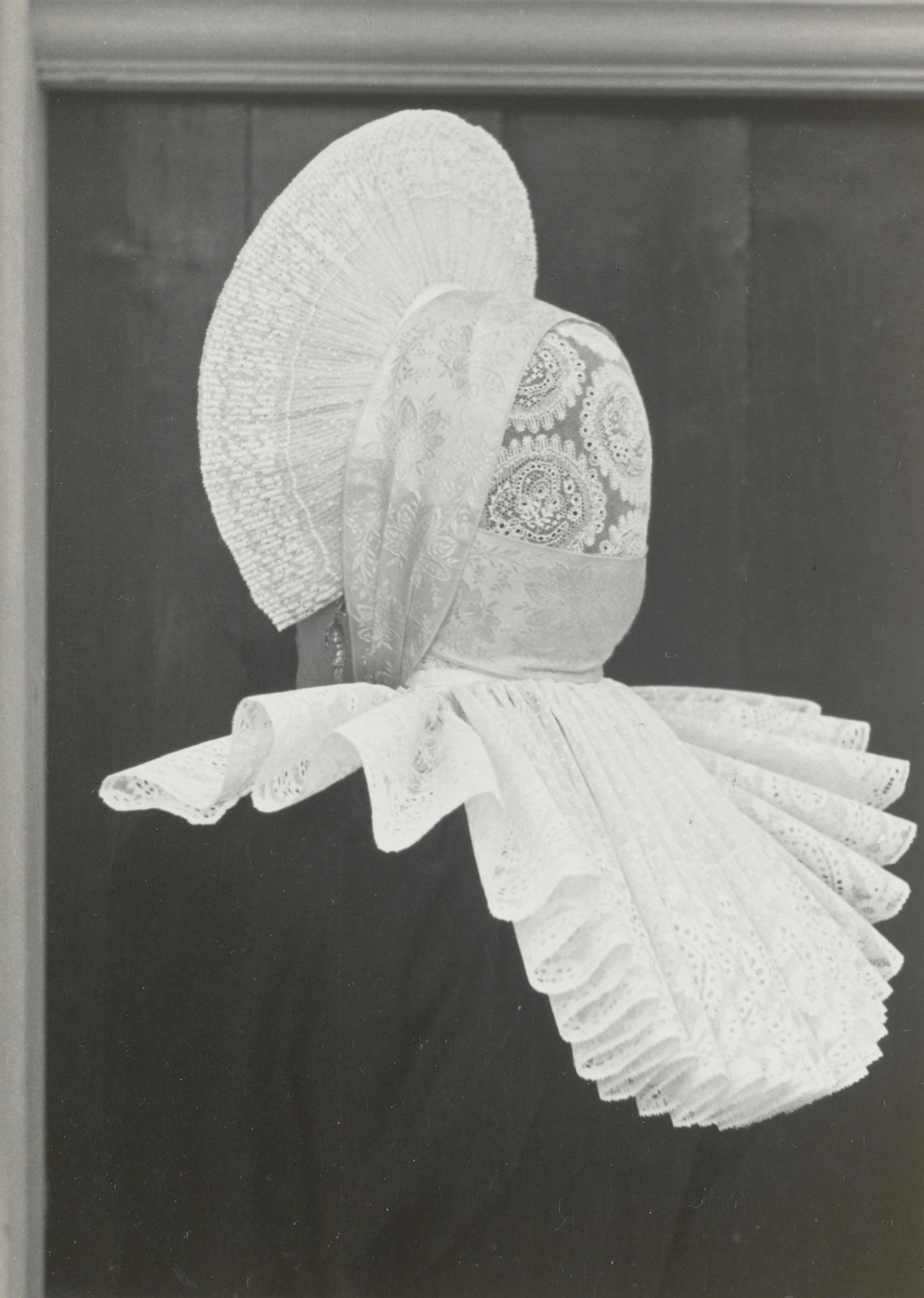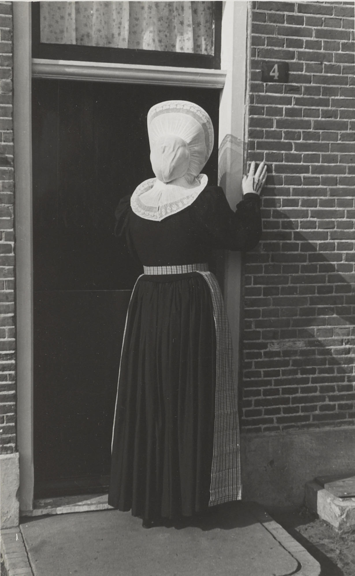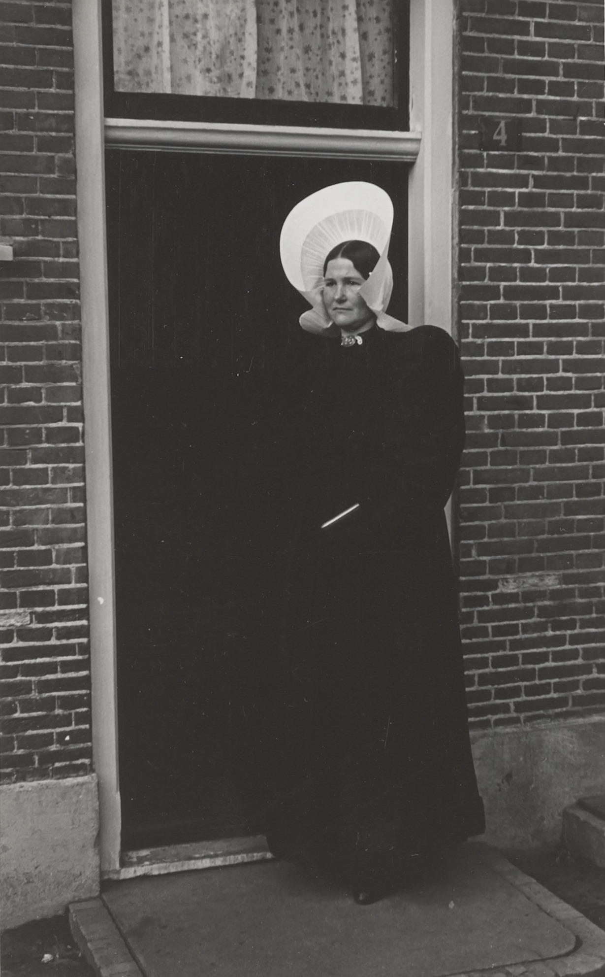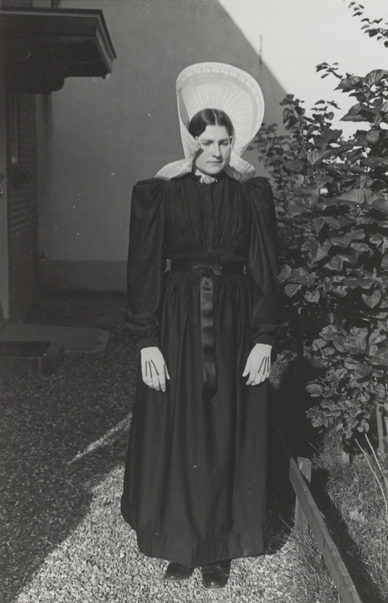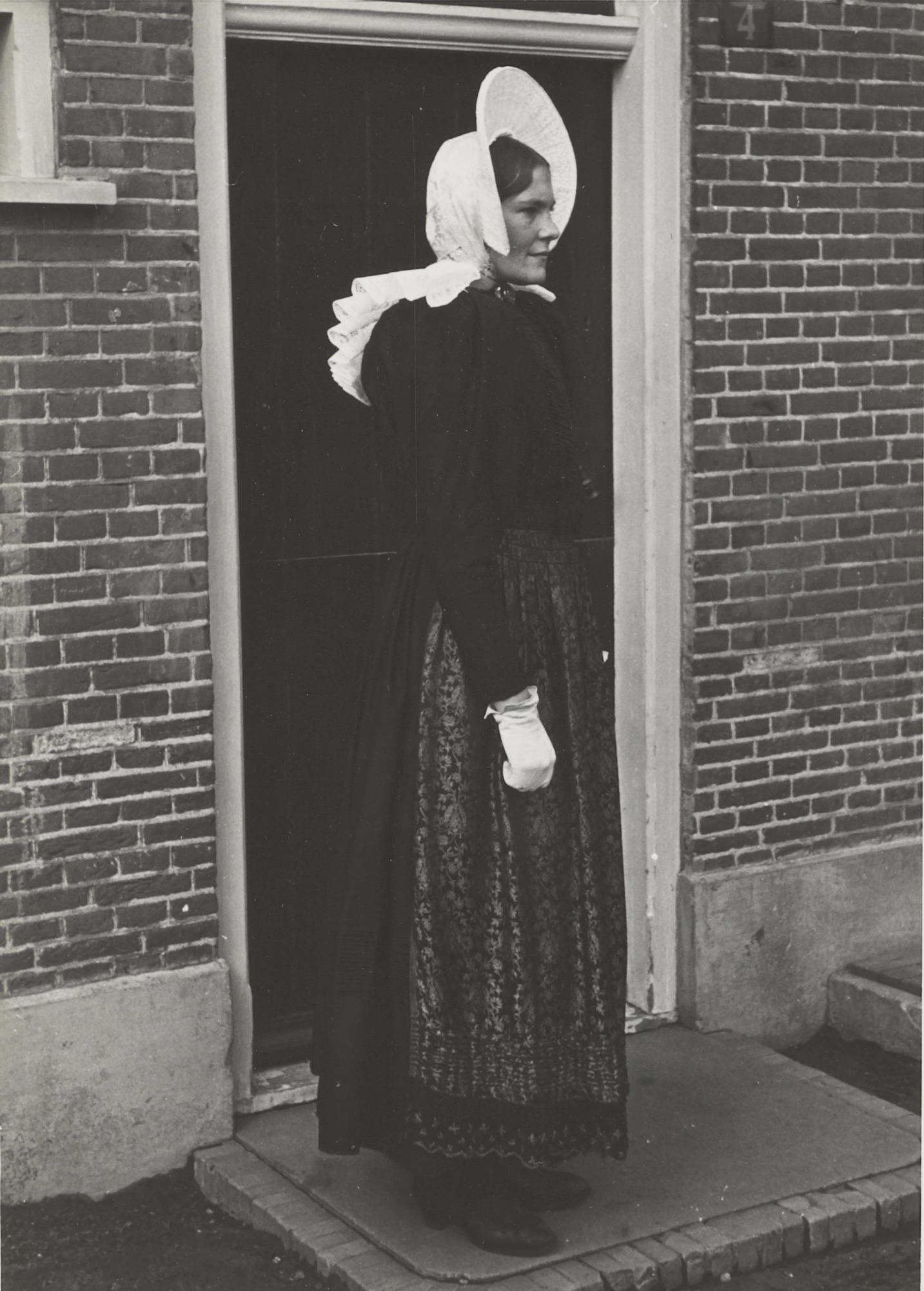 Vrouw in streekdracht, Huizen, 1945 (zwart-wit foto)