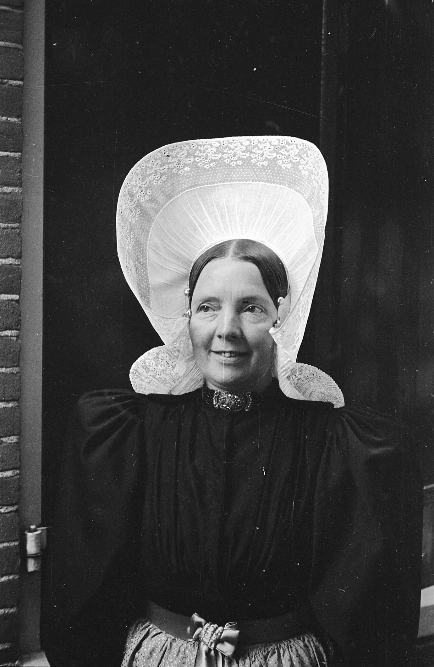 Vrouw in streekdracht, Huizen, 1945 (zwart-wit negat...