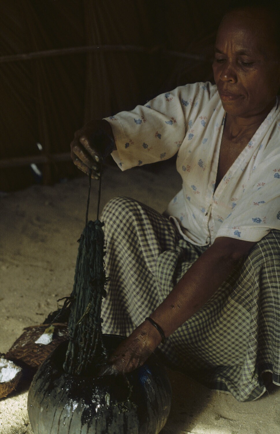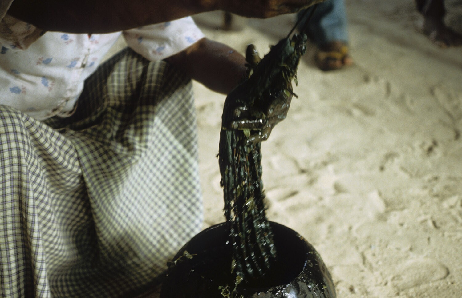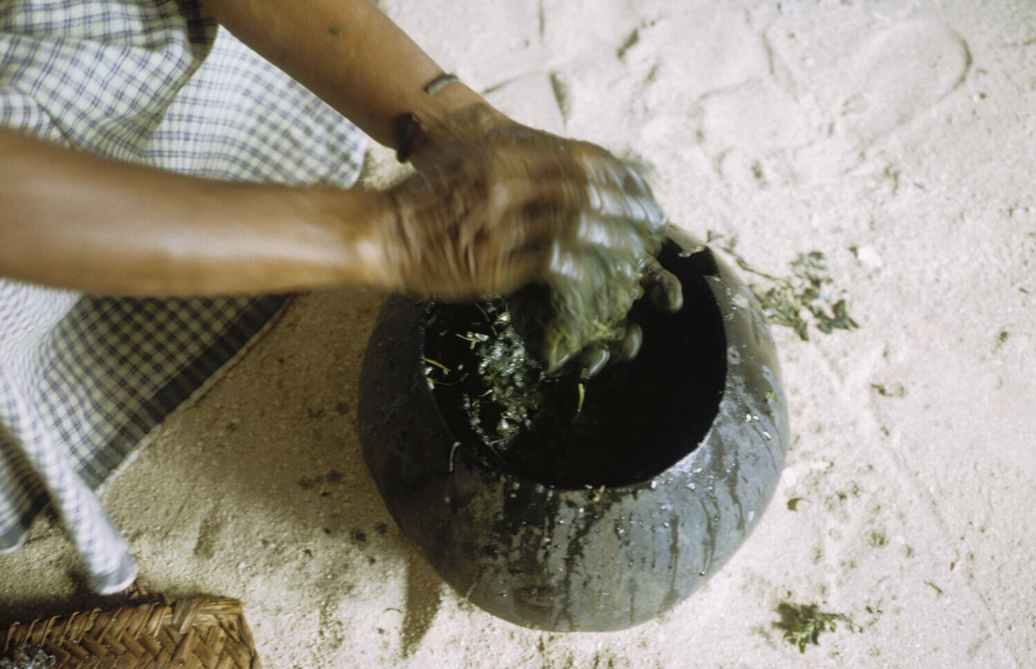 De geplukte indigobladeren worden met de hand fijnge...