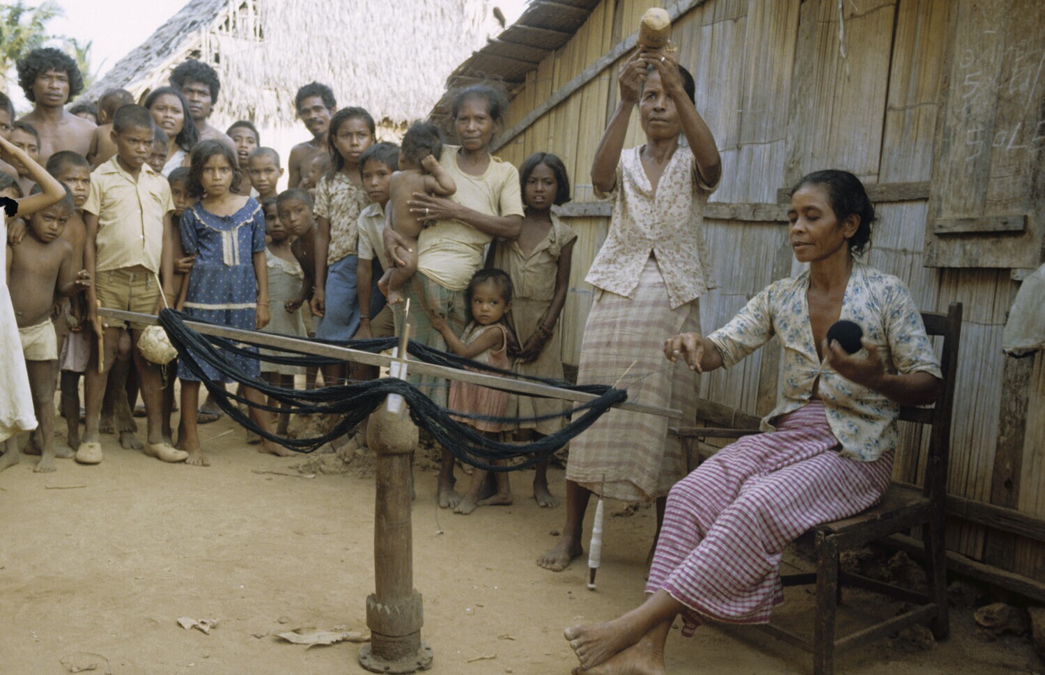 Na verven en drogen worden de draden opgerold. Kanda...