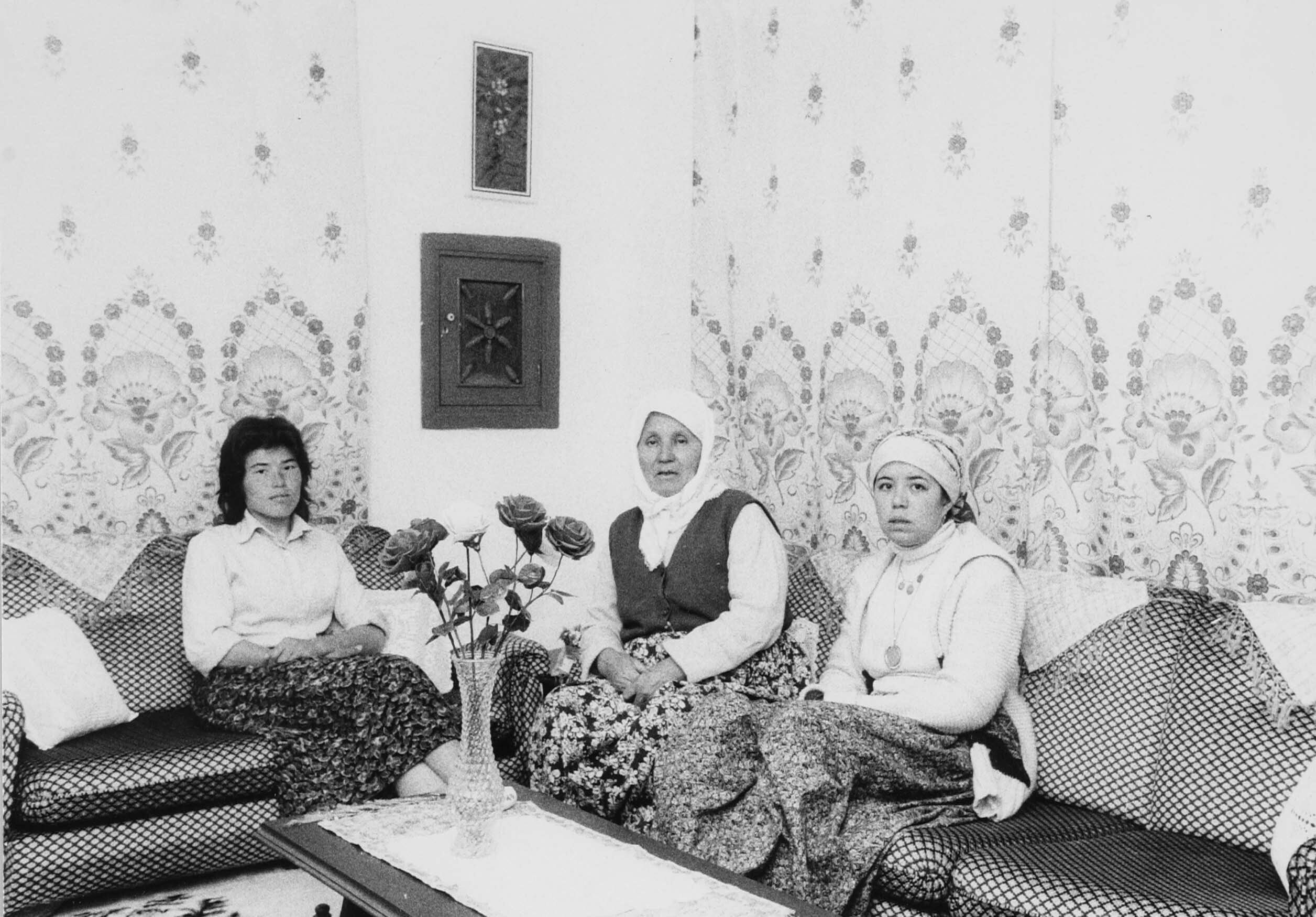Vrouwen poserend voor een type woning afkomstig uit ...