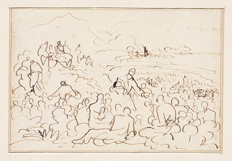 Jezus met zijn discipelen achter zich doet gewapende...