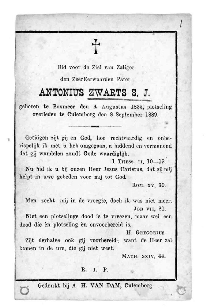 bidprent voor Antonius Zwarts S.J.. Geboren 04-08-18...