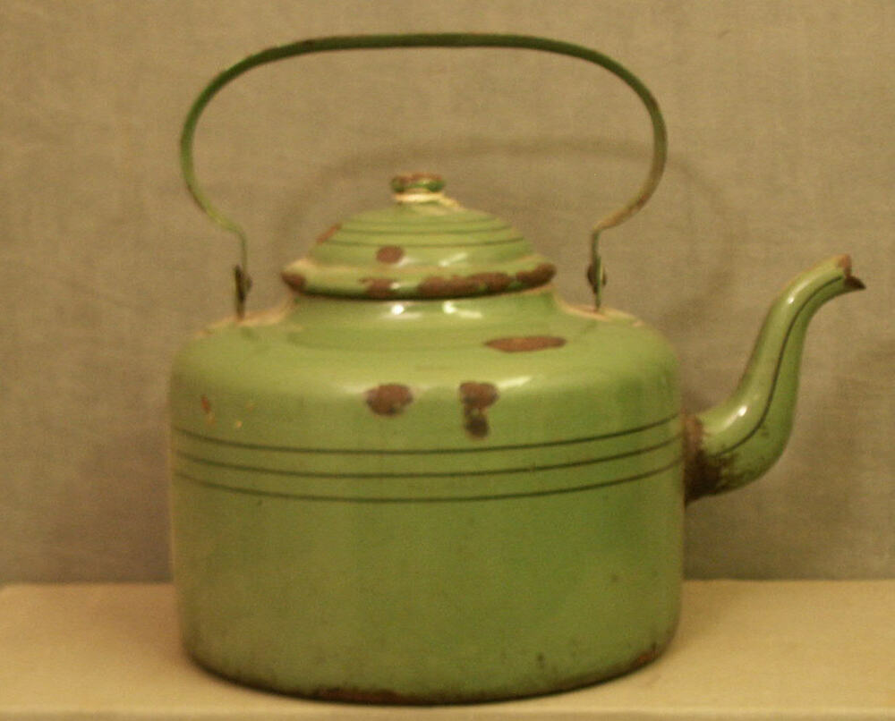 waterketel van groen geëmailleerd ijzer, uit de eers...