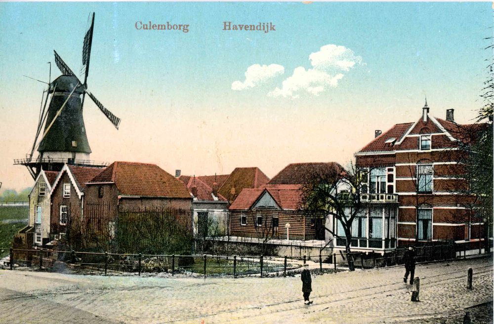 Ansichtkaart, voorstellende de Havendijk en molen "D...