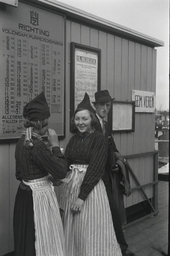 Meisjes in klederdracht bij het dienstregelingsbord ...