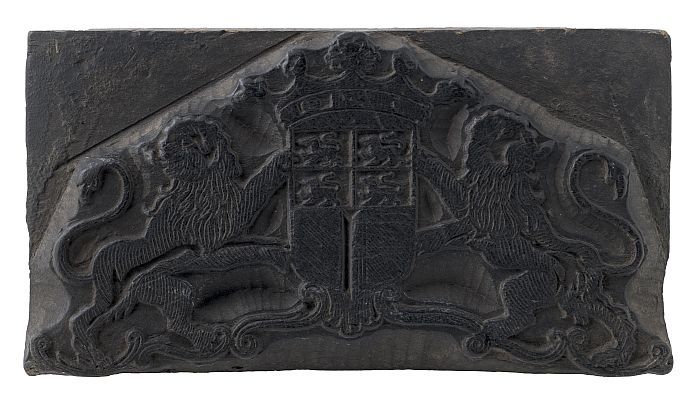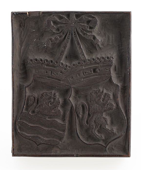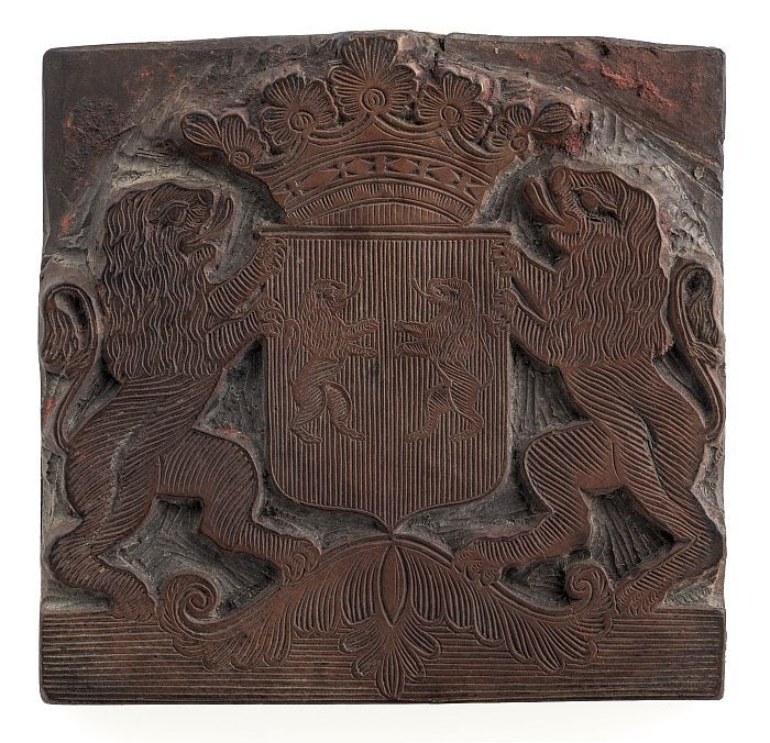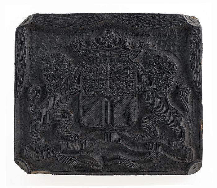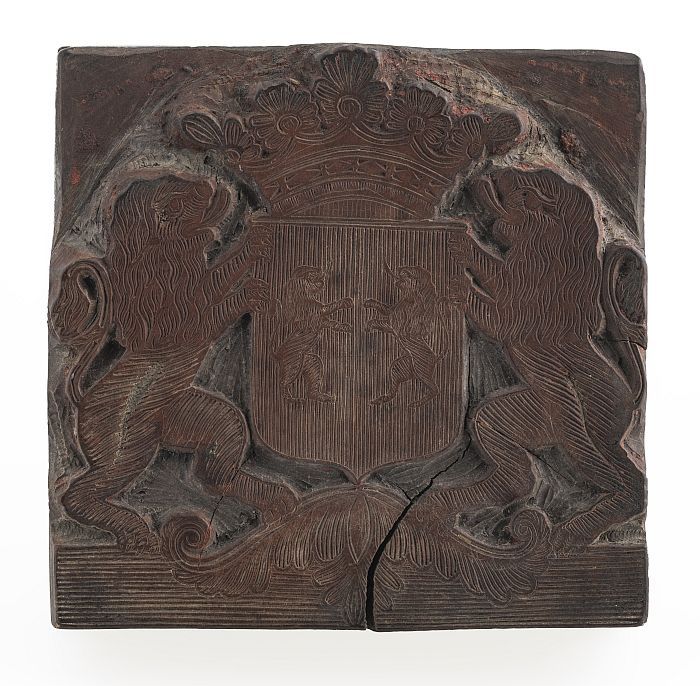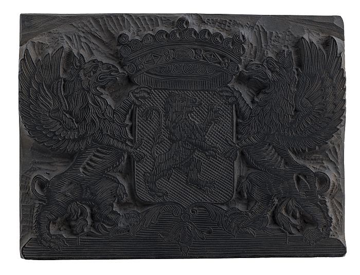 Houten cliché voor gekroond wapen met de leeuw in de...
