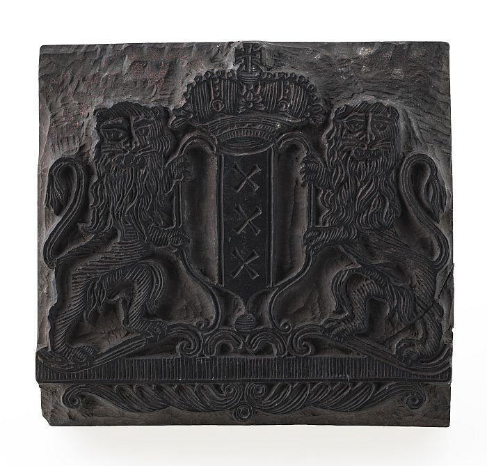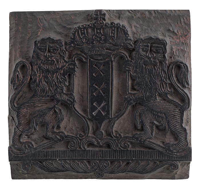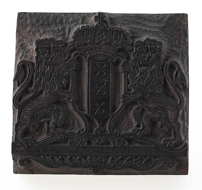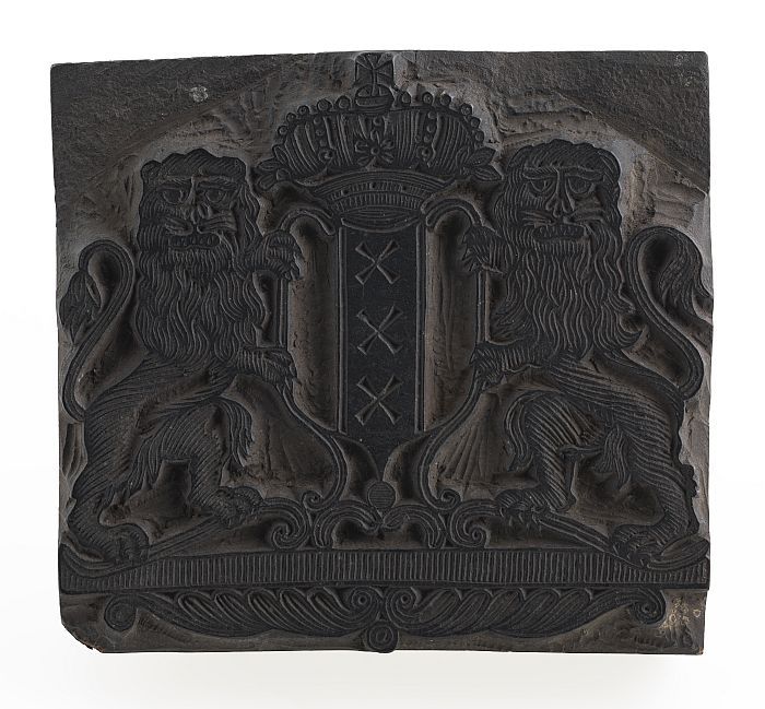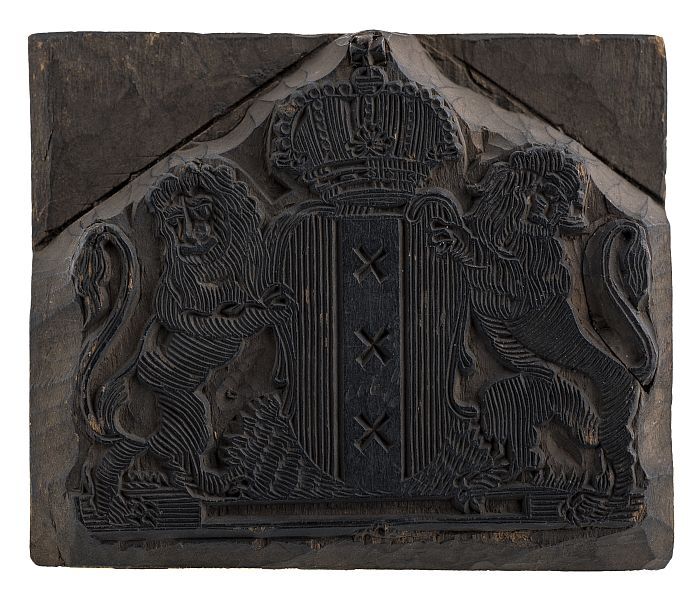 Houten cliché voor het wapen van Amsterdam met kroon...