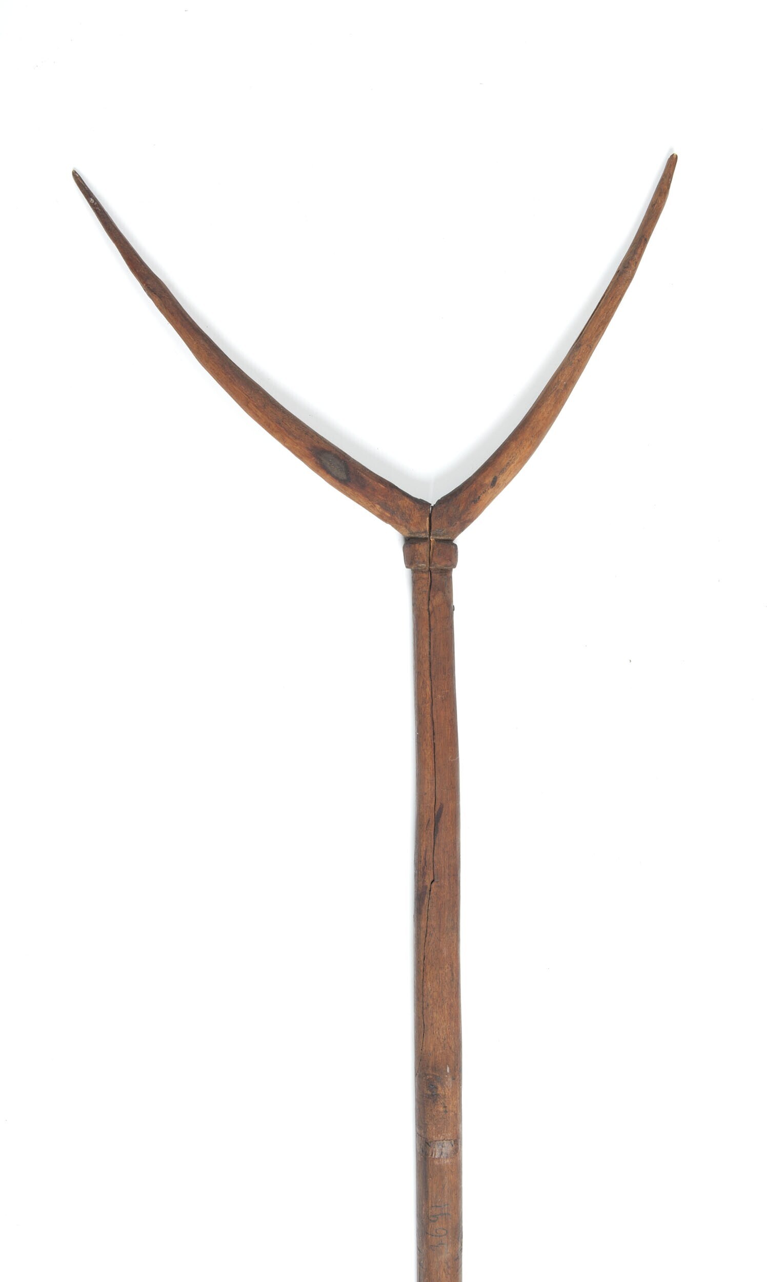 Model van een vangvork van hout met twee tanden