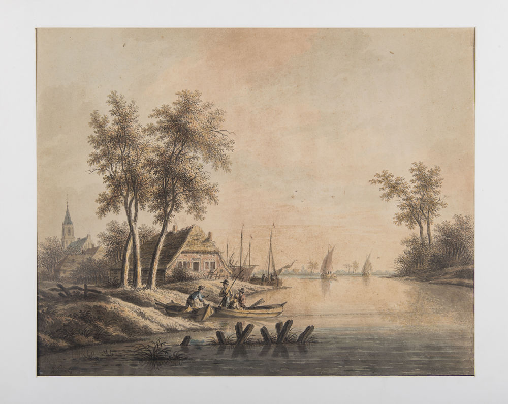 Aquarel, voorstellende het dorp Maurik vanaf de rivi...