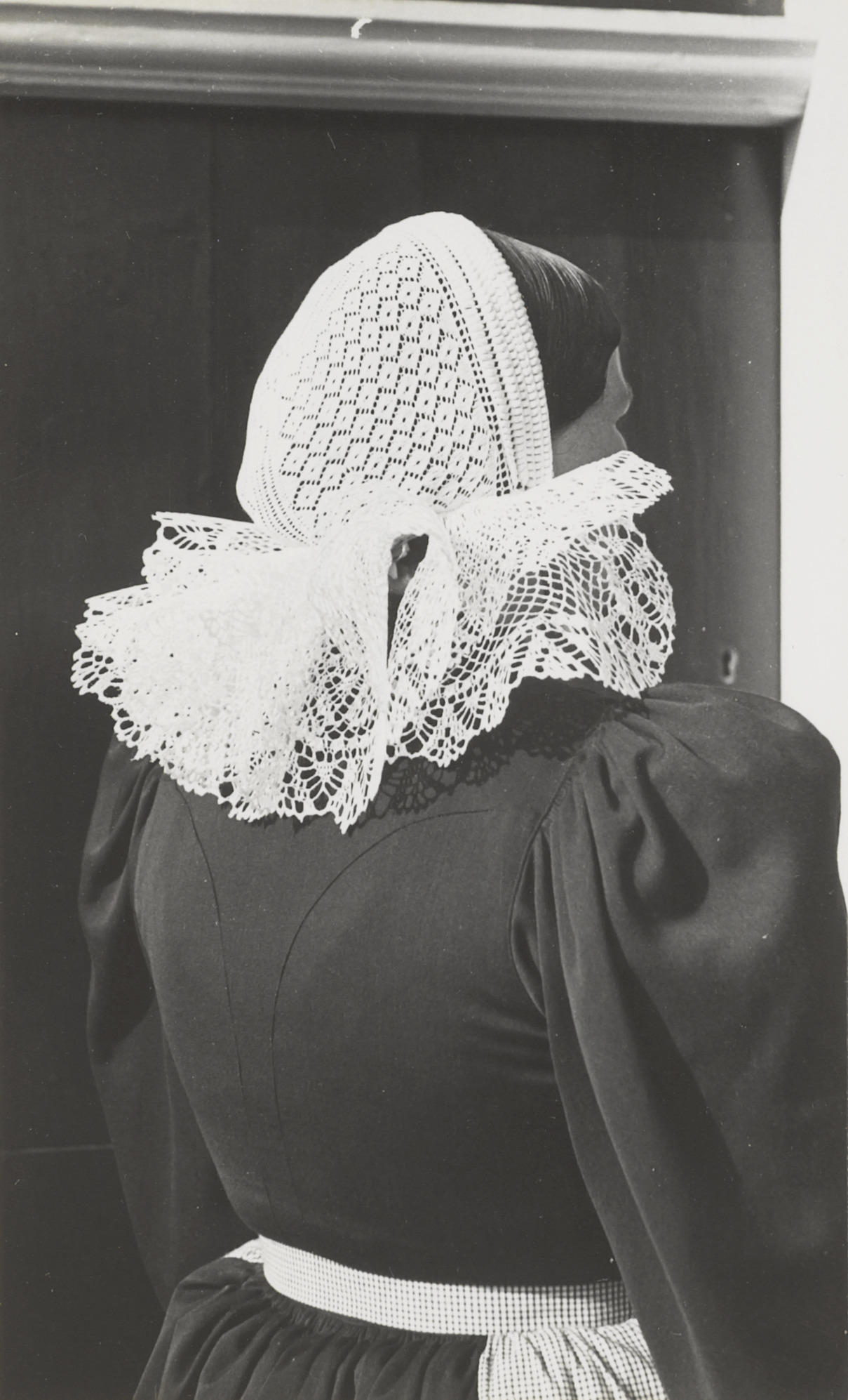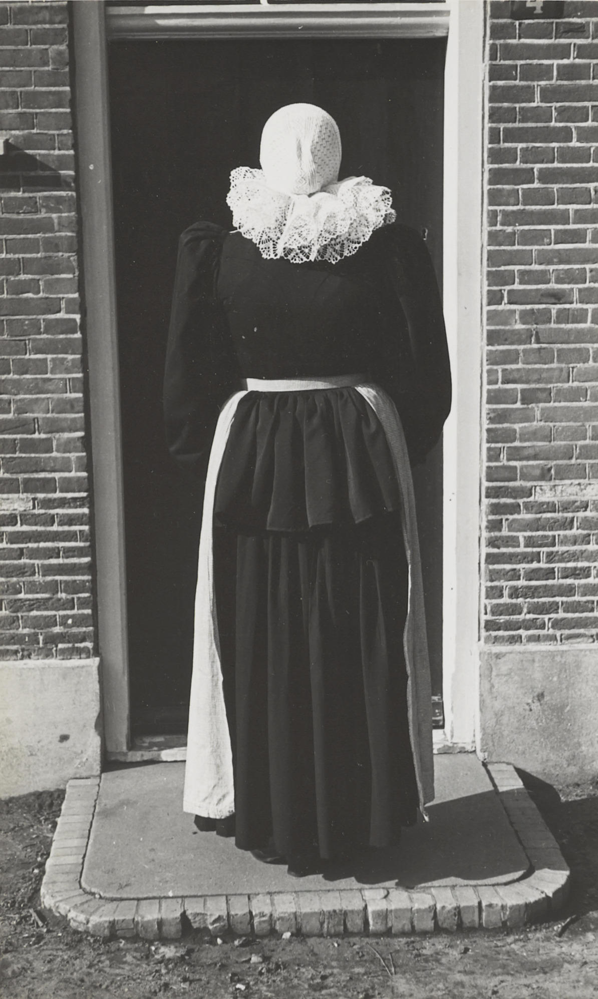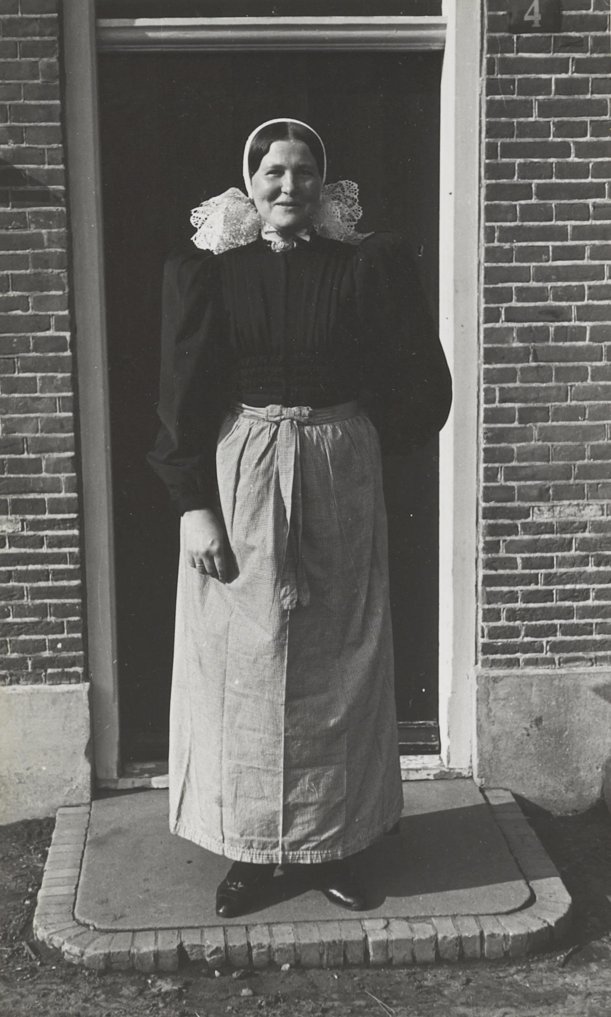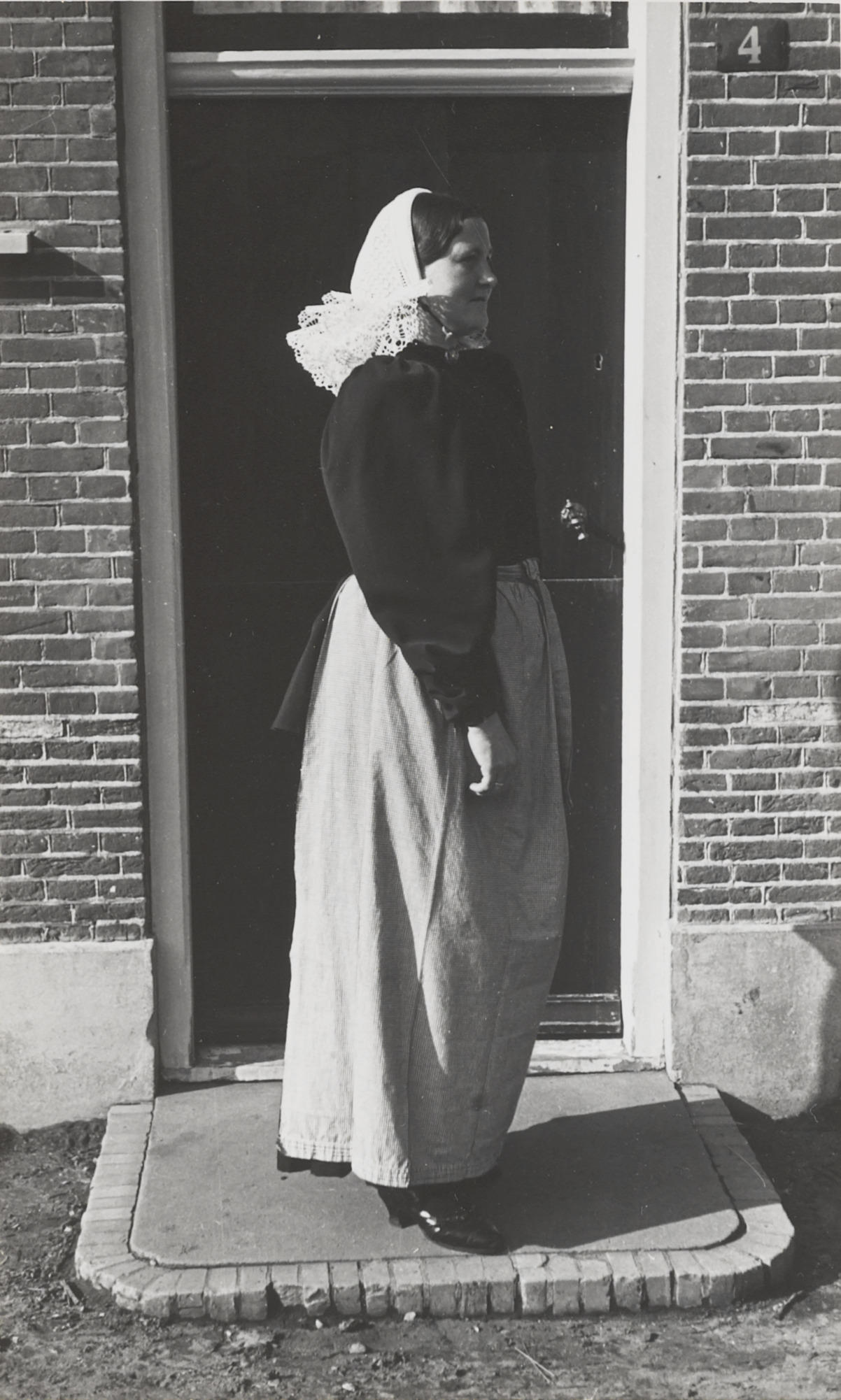 Vrouw in streekdracht, Huizen, 1945 (zwart-wit foto)