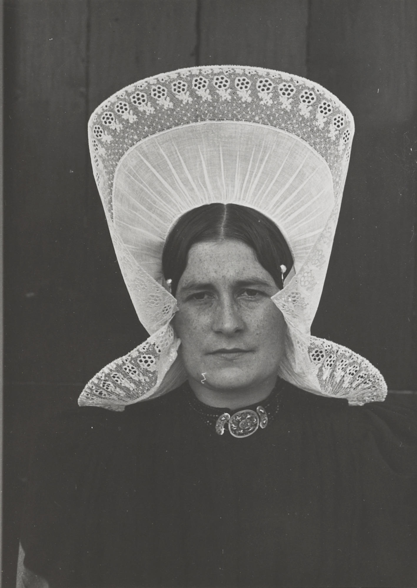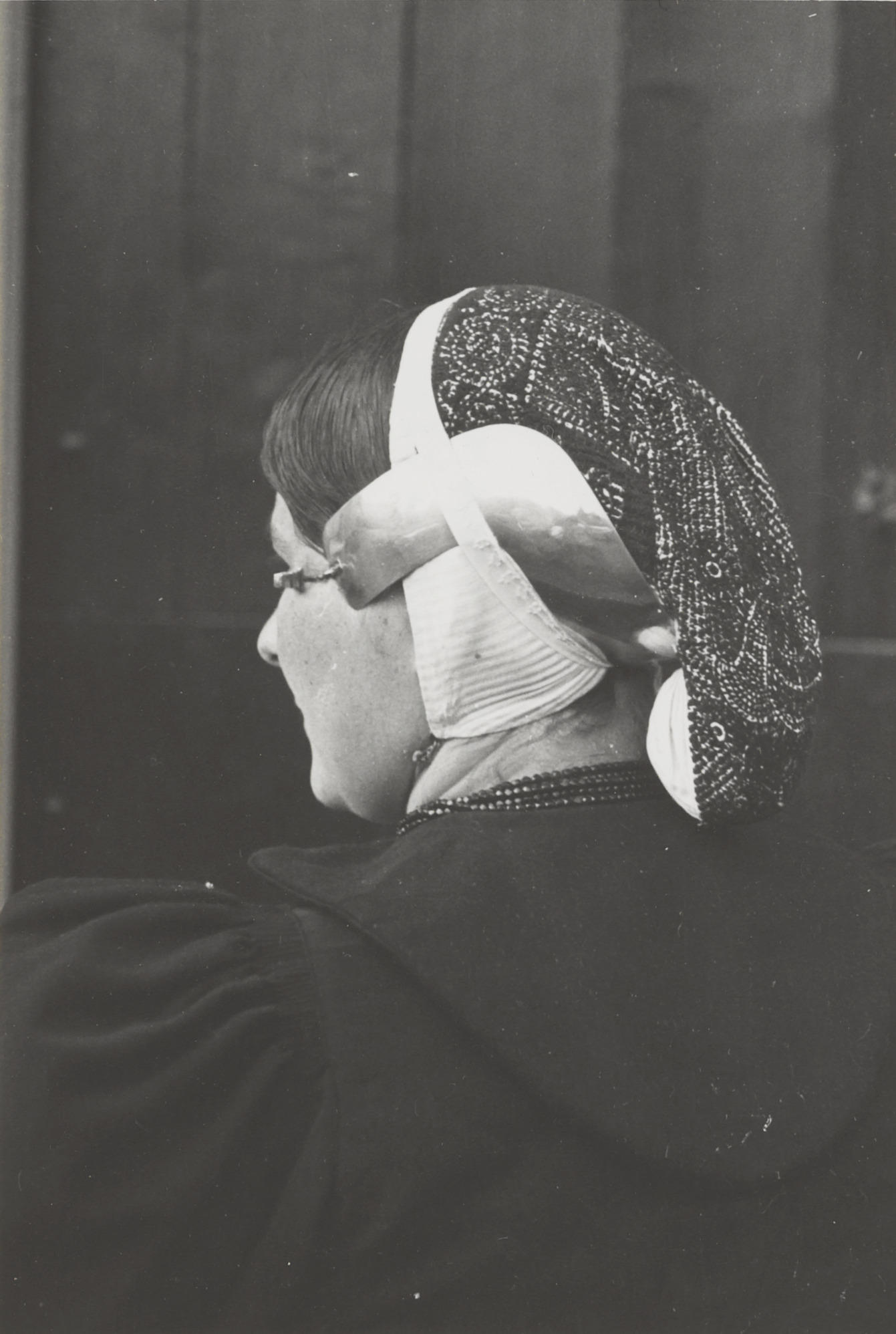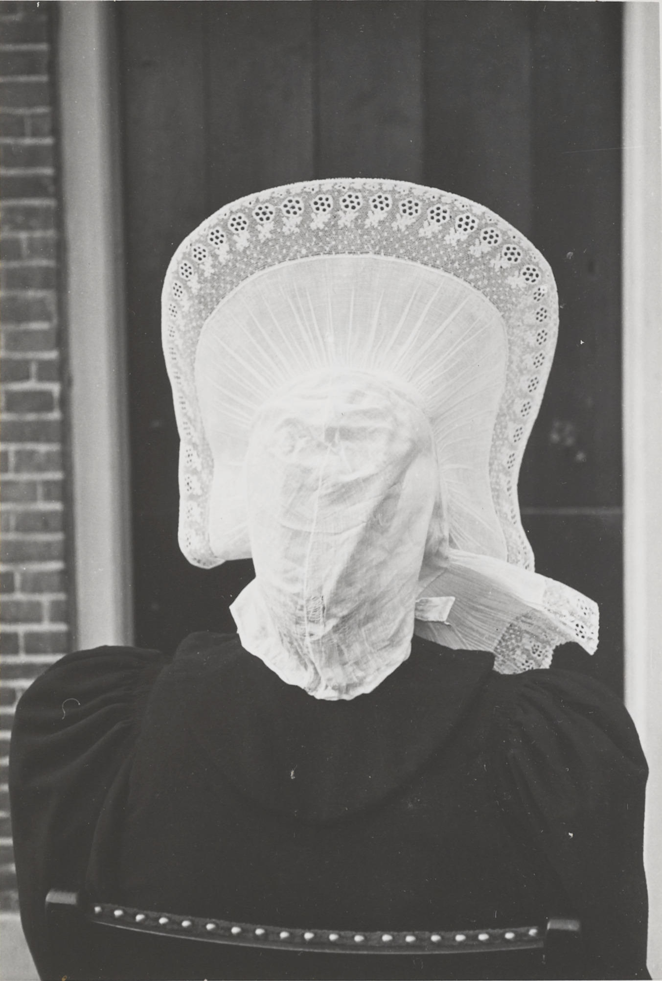 Vrouw in streekdracht, Huizen, 1945 (zwart-wit foto)