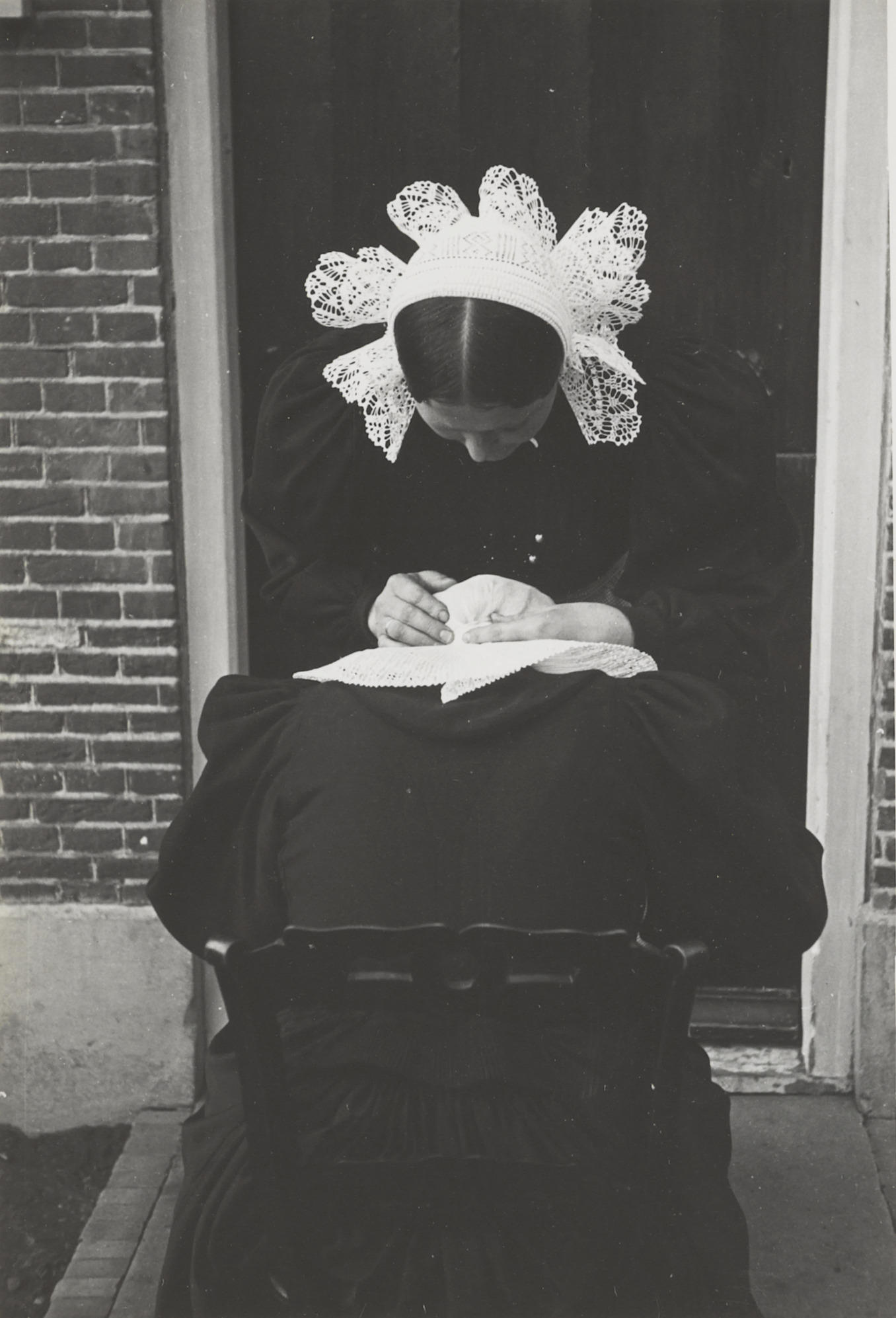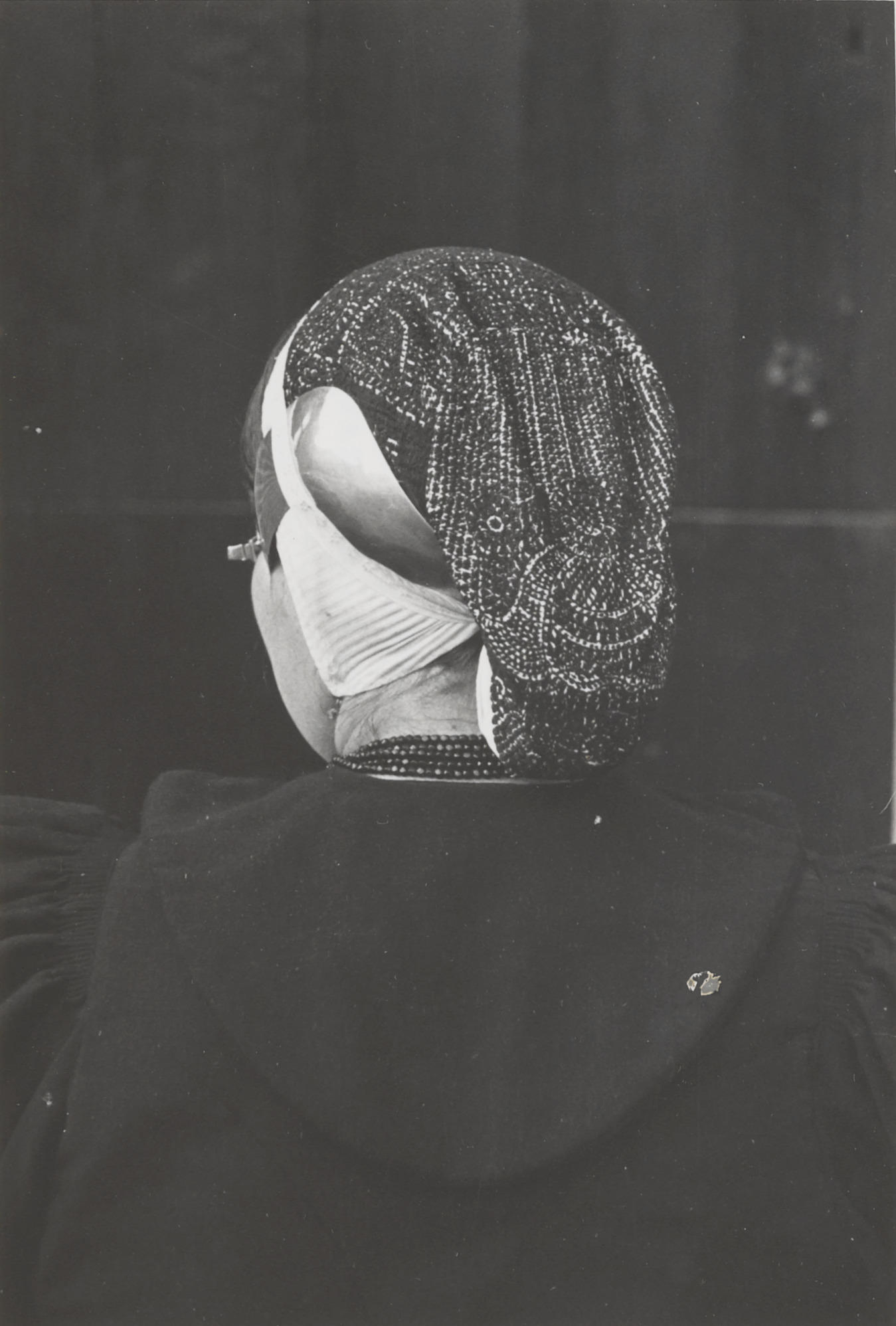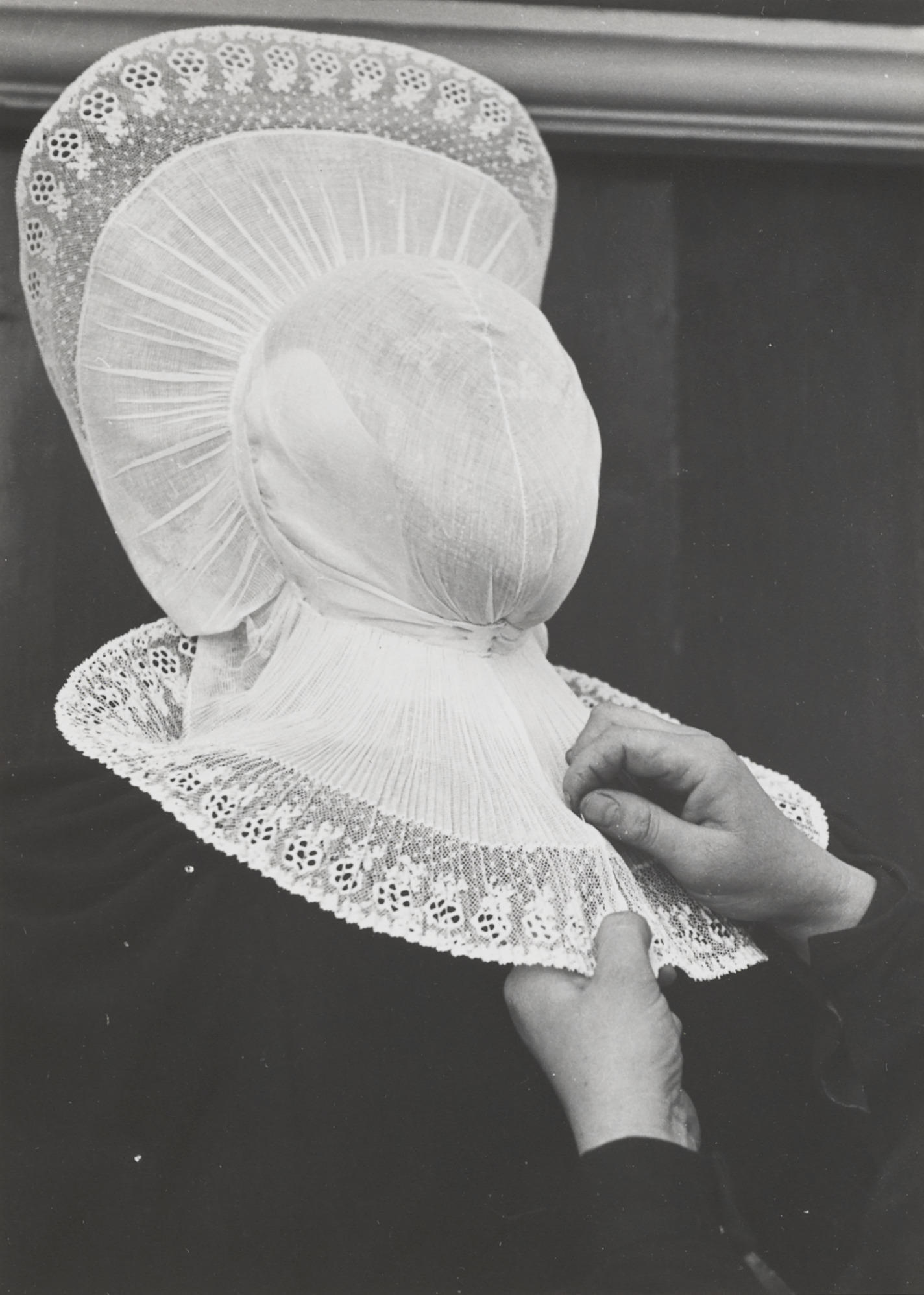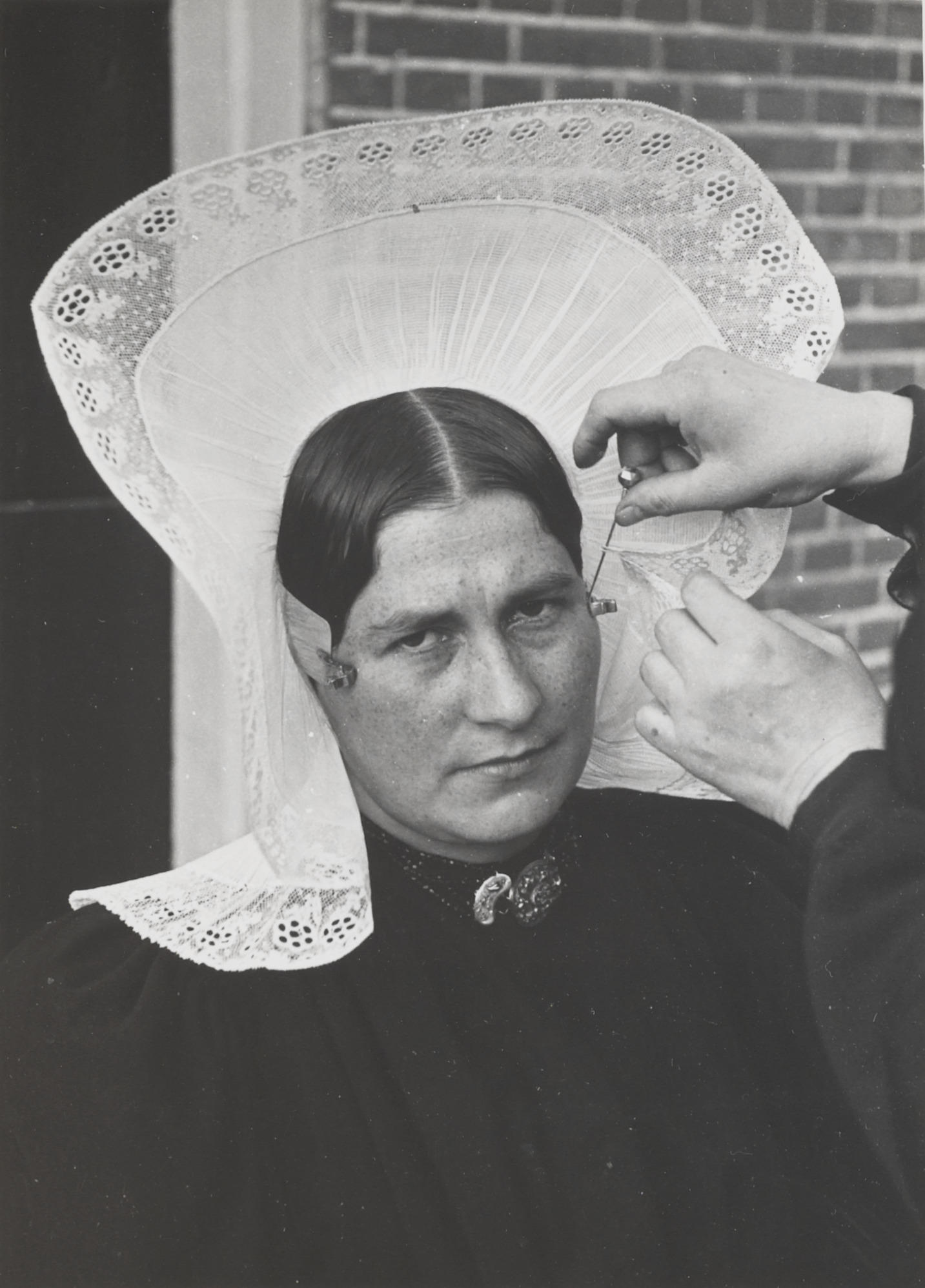 Vrouw in streekdracht, Huizen, 1945 (zwart-wit foto)